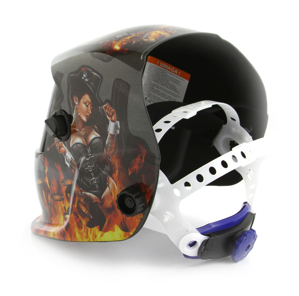 Wysokiej jakości przyłbica samościemniejąca. Maska nadaje się do spawania wieloma metodami spawania łukowego: MIG, TIG, MAG, MMA. Chroni użytkownika przed szkodliwym promieniowaniem powstającym podczas spawania oraz przed iskrami i odpryskami. Specjalny czujnik umieszczony w kasecie filtrującej automatycznie identyfikuje rozpoczęcie procesu spawania, uruchamiając funkcję samo-zaciemnienia. Po zakończeniu pracy filtr samoczynnie wraca do stanu rozjaśnienia. Filtr jest zasilany wewnętrznymi bateriami, które ładują się samoczynnie za pośrednictwem ogniw słonecznych. Maska wyposażona jest w wielostopniową regulację umożliwiającą dostosowanie jej do wielkości głowy użytkownika. Dzięki niedużej wadze jest bardzo wygodna w użyciu.
