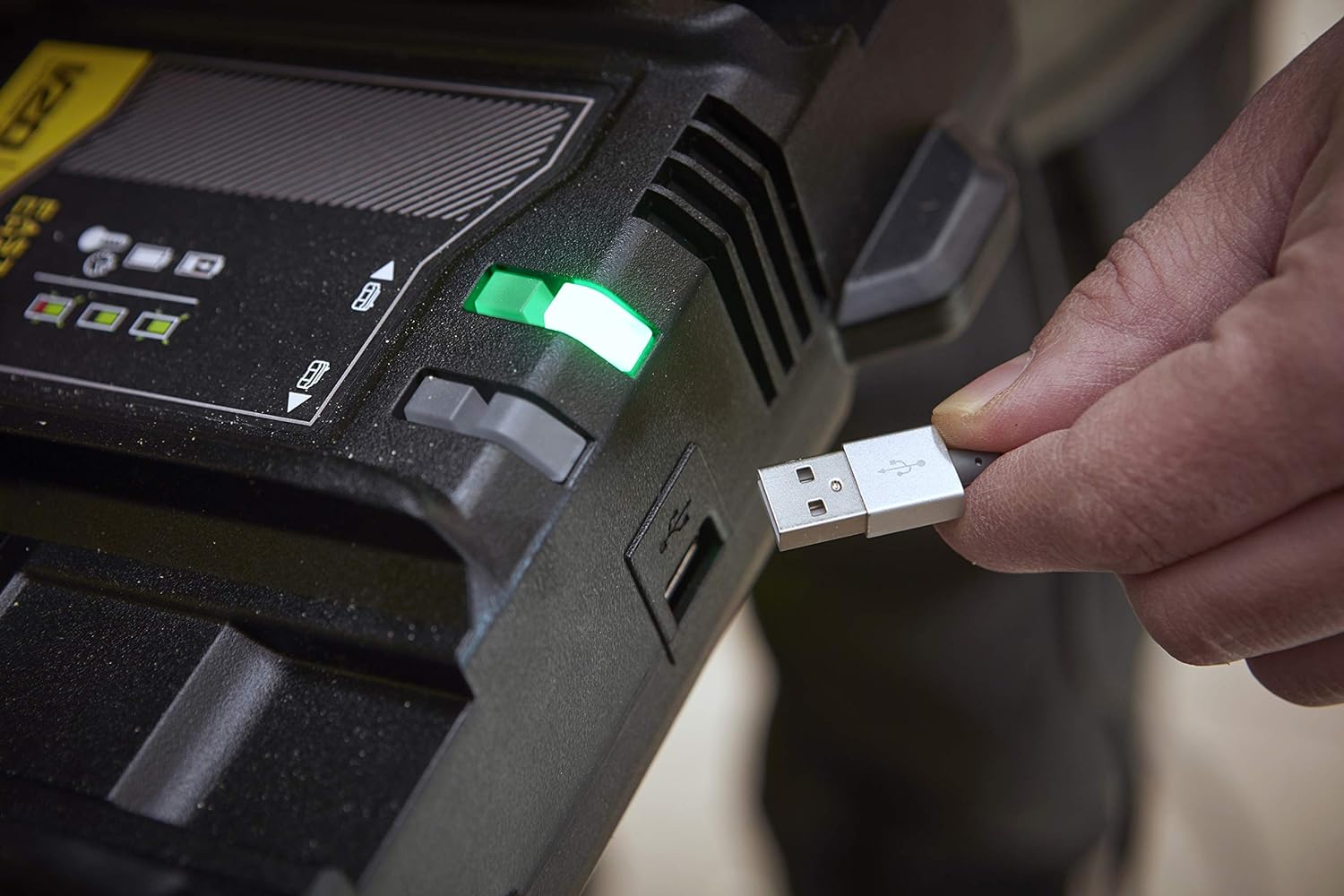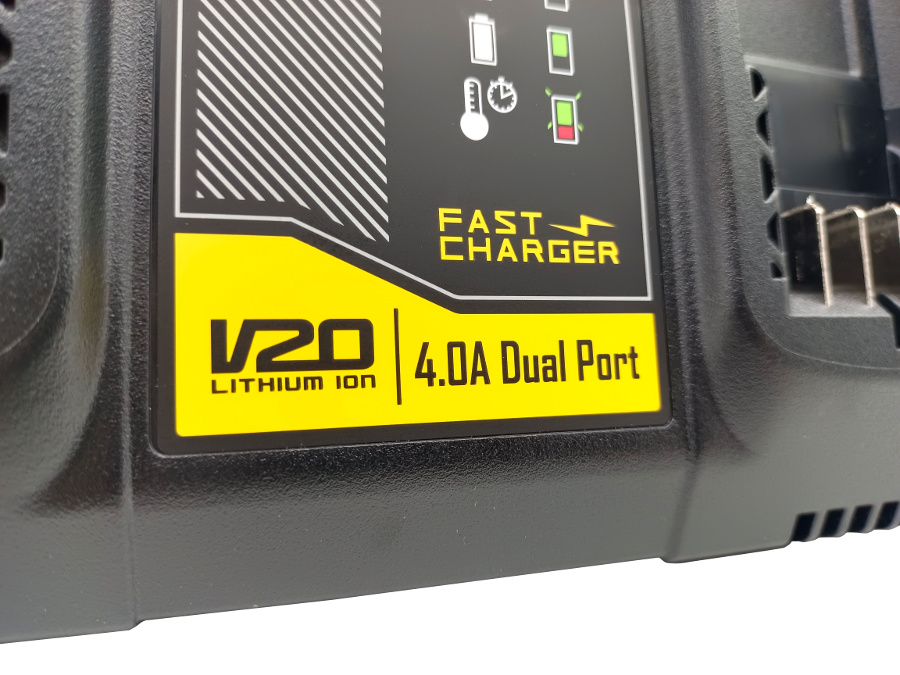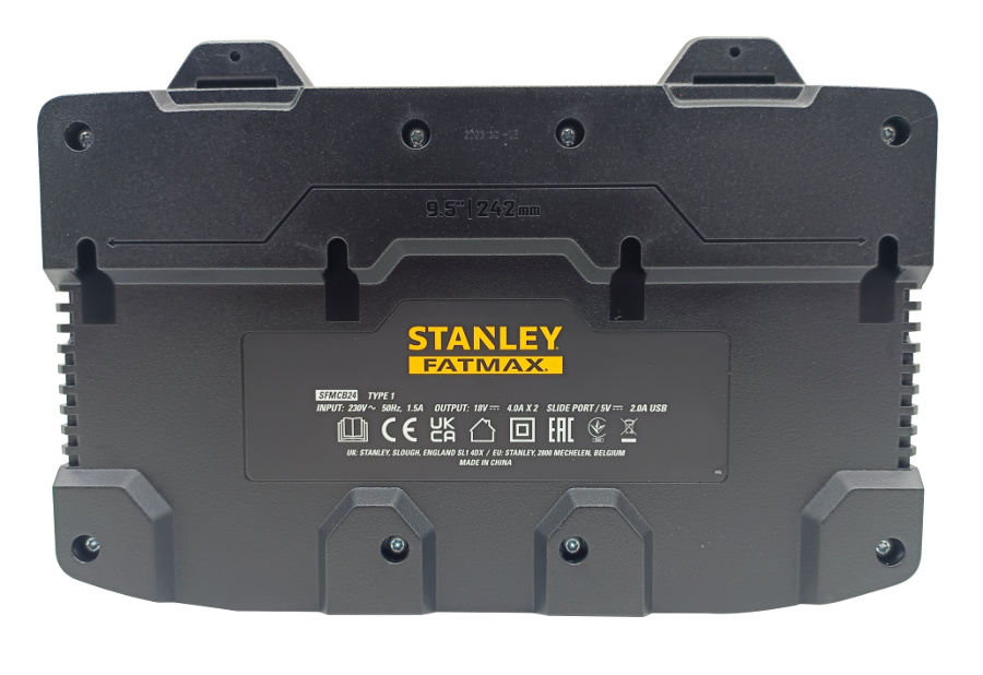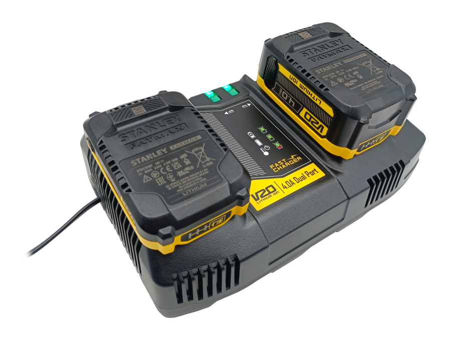 Podwójna ładowarka marki STANLEY FATMAX model SFMCB24-QW, przeznaczona do ładowania akumulatorów Stanley Seria V20. Ładowarka posiada funkcję diagnostyki akumulatorów z jasną diodą, informuje użytkownika o stanie ładowania akumulatora. Dwa porty dają możliwość jednoczesnego ładowania dwóch akumulatorów z serii V20. Wbudowany port USB do ładowania telefonów, tabletów itp. Część nowego systemu akumulatorowego 18V STANLEY® FATMAX® V20 — zasilaj wszystkie narzędzia V20 zwykłym, nowym i ulepszonym akumulatorem litowo-jonowym 18 V, który zapewnia bezproblemową pracę.
