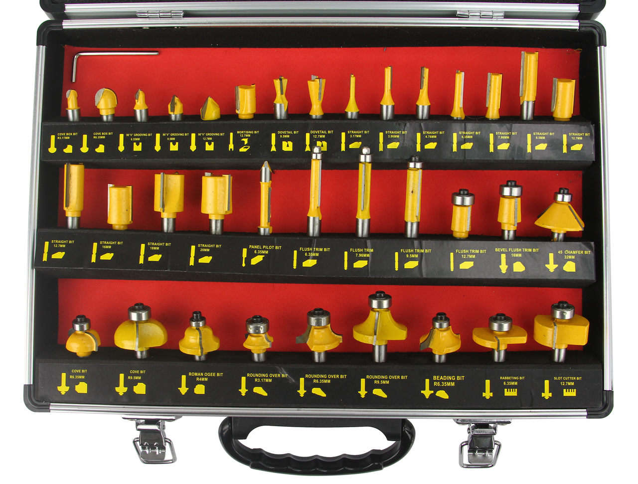 Precyzyjne frezy do drewna, pozwalają na obróbkę materiału z dokładnością do 0,08 mm. Różnorodność kształtów powoduje, że mają one szerokie zastosowanie w zakładach stolarskich wyspecjalizowanych w precyzyjnej obróbce drewna. Frez posiada mocowanie na wrzecionie o średnicy 8 mm. Wybrane frezy mają łożyskowanie, zmniejszające tarcie oraz bardzo twarde ostrze, wykonane ze stali szybkotnącej HSS. Komplet frezów znajduje się w profesjonalnej walizce, każdy z frezów ma swoje podpisane miejsce. Niezastąpiony zestaw każdego warsztatu stolarskiego i nie tylko.