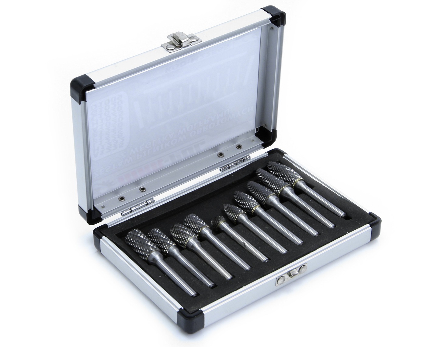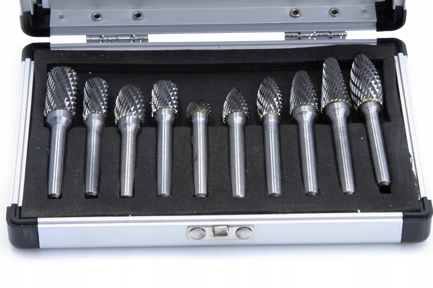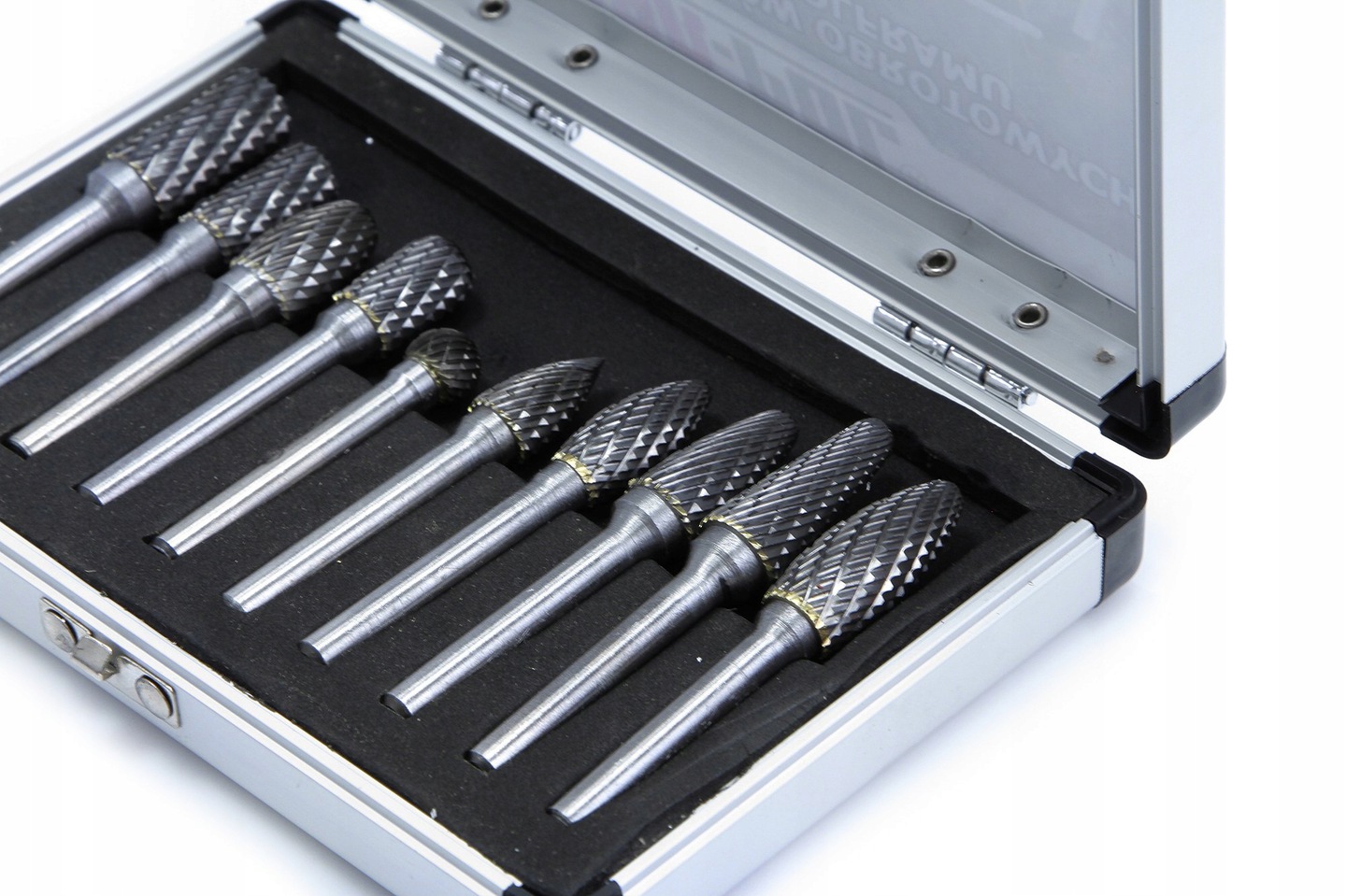 Zestaw pilników obrotowych z węglika wolframu. Idealnie nadają się do kształtowania, wygładzania i usuwania materiałów takich jak: Zestaw 10 pilników rotacyjnych z węglika wolframu w praktycznym metalowym etui.
