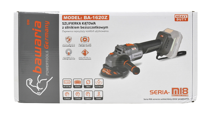 Nowoczesna akumulatorowa szlifierka kątowa 125 mm to niezastąpione narzędzie w każdym warsztacie, garażu czy na budowie. Zasilana wydajnym akumulatorem litowo-jonowym 18 V (brak w zestawie) , oferuje dużą moc, długi czas pracy i pełną mobilność – bez plączących się przewodów i ograniczeń wynikających z dostępu do gniazdka. Dzięki zastosowaniu bezszczotkowego silnika (BLDC) urządzenie charakteryzuje się zwiększoną wydajnością, mniejszym poborem energii i znacznie dłuższą żywotnością w porównaniu do modeli szczotkowych. Szlifierka utrzymuje wysoką prędkość obrotową nawet pod dużym obciążeniem, co przekłada się na szybkie i precyzyjne cięcie oraz szlifowanie różnorodnych materiałów. Szlifierka została zaprojektowana do pracy z tarczami o średnicy 125 mm, co zapewnia doskonały balans między precyzją a efektywnością. Użytkownik ma do dyspozycji trzystopniową regulację prędkości obrotowej, dzięki czemu można łatwo dostosować tempo pracy do rodzaju materiału – od delikatnego szlifowania po intensywne cięcie metalu czy betonu. Dla maksymalnego bezpieczeństwa szlifierka została wyposażona w system KickBack, który natychmiast odłącza zasilanie w przypadku zablokowania lub nagłego spowolnienia tarczy. Chroni to użytkownika przed utratą panowania nad narzędziem. Dodatkowo funkcja antyrestart zabezpiecza przed przypadkowym uruchomieniem szlifierki po ponownym podłączeniu akumulatora – ważne zwłaszcza podczas serwisowania czy wymiany tarczy. Funkcja łagodnego rozruchu sprawia, że narzędzie uruchamia się płynnie, bez gwałtownego szarpnięcia. Natomiast hamulec elektryczny szybko zatrzymuje obracającą się tarczę po zwolnieniu włącznika, zwiększając bezpieczeństwo i skracając czas między kolejnymi operacjami. Szlifierka jest kompatybilna z akumulatorami Makita 18V》》》 SZLIFIERKA KĄTOWA AKUMULATOROWA BEZSZCZOTKOWA KĄTÓWKA 125mm BAWARIA BODY BA1620-0 《《《