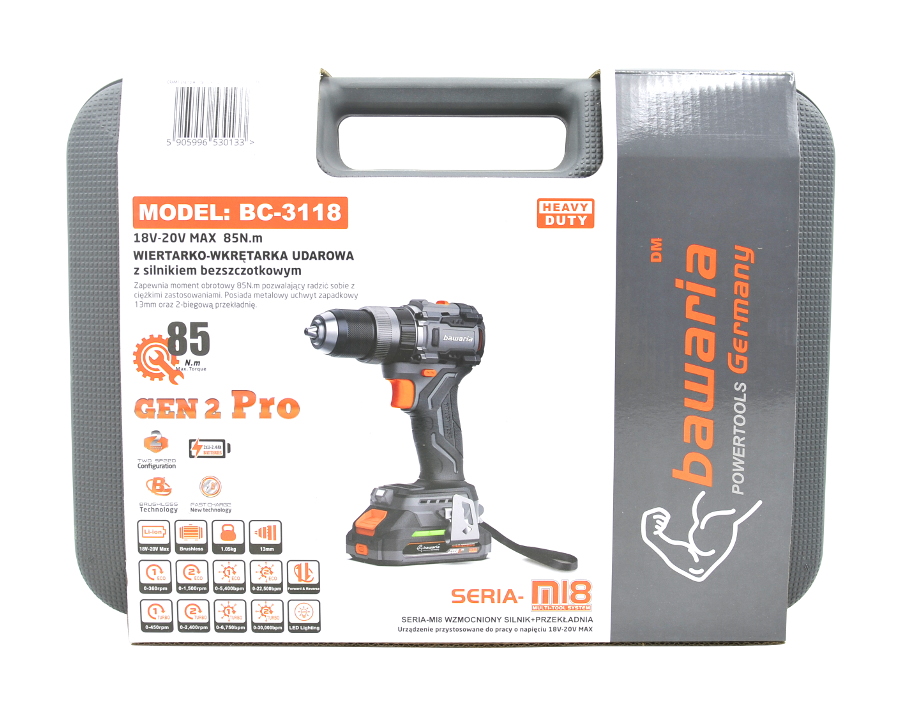 Wiertarko-wkrętarka udarowa Bawaria 18 V – nowoczesne narzędzie bezszczotkowe, które łączy w sobie wysoką moc (aż 85 Nm momentu obrotowego), kompaktową budowę oraz udar do pracy w murze i betonie. Idealna zarówno do profesjonalnych zastosowań, jak i użytku domowego. Zastosowanie: Wiercenie i wkręcanie w drewno, metal, tworzywa sztuczne Wiercenie z udarem w cegle i lekkim betonie Montaż mebli, prace remontowe i instalacyjne Użytkowanie warsztatowe i profesjonalne ➜ Wiertarko-wkrętarka Bavaria 18 V ➜ 2× akumulator 2,6 Ah Li-Ion ➜ Szybka ładowarka ➜ Praktyczna walizka transportowa ➜ Bit dwustronny + uchwyt do paska ➜ Instrukcja obsługi w języku polskim》》》 WIERTARKO WKRĘTARKA UDAROWA AKUMULATOROWA 85NM 18V 2x 2,6Ah BAWARIA BC3118 《《《