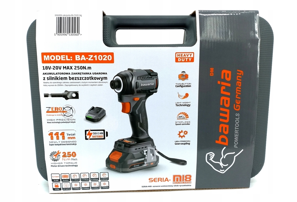 Smukła konstrukcja i zmniejszona długość całkowita umożliwiają łatwe wkręcanie w narożnikach i miejscach o ograniczonej przestrzeni. 4-stopniowa regulacja prędkości i częstotliwości udaru, sterowana elektronicznie, zapewnia pełną kontrolę nad każdym zadaniem, a spust umożliwia intuicyjną regulację obrotów. Dzięki bezszczotkowemu silnikowi narzędzie jest bardziej wydajne, a jego żywotność znacznie dłuższa niż w tradycyjnych modelach. Przeniesiony do tylnej części uchwytu panel sterowania pozwala na wygodną zmianę trybu pracy bez przerywania czynności. Dodatkowo pierścień LED równomiernie oświetla miejsce pracy, redukując cień rzucany przez bit, dzięki czemu każdy detal jest dobrze widoczny. To narzędzie idealne dla profesjonalistów i majsterkowiczów, którzy potrzebują wydajnej, wszechstronnej i łatwej w użyciu wkrętarki do każdego zadania.》》》 ZAKRĘTARKA BEZSZCZOTKOWA UDAROWA AKUMULATOROWA 250NM 18V 2 x 2,6Ah BAZ1020 《《《