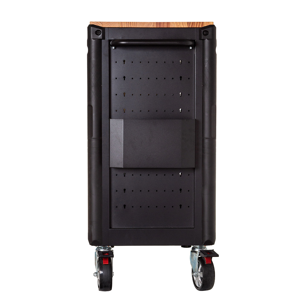 Szafka posiada obrotowe kółka z hamulcem blokującym i praktycznym uchwytem do pchania ułatwiającym przesuwanie.