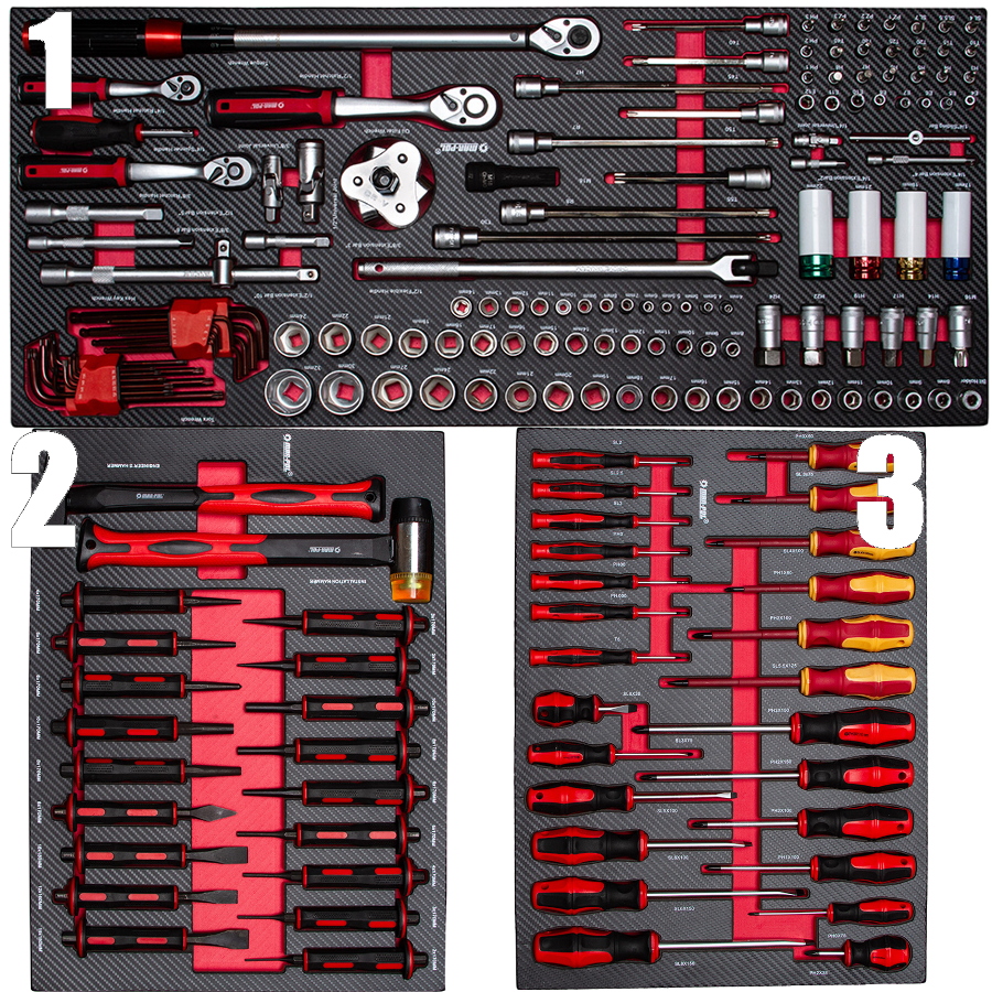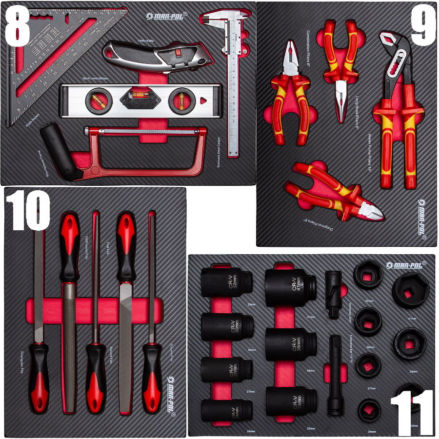 - 19 szt. - nasadek 6-kątnych 1/2”: 8, 9, 10, 11, 12, 13, 14, 15, 16, 17, 18, 19, 20, 21, 22, 24, 27, 30, 32mm