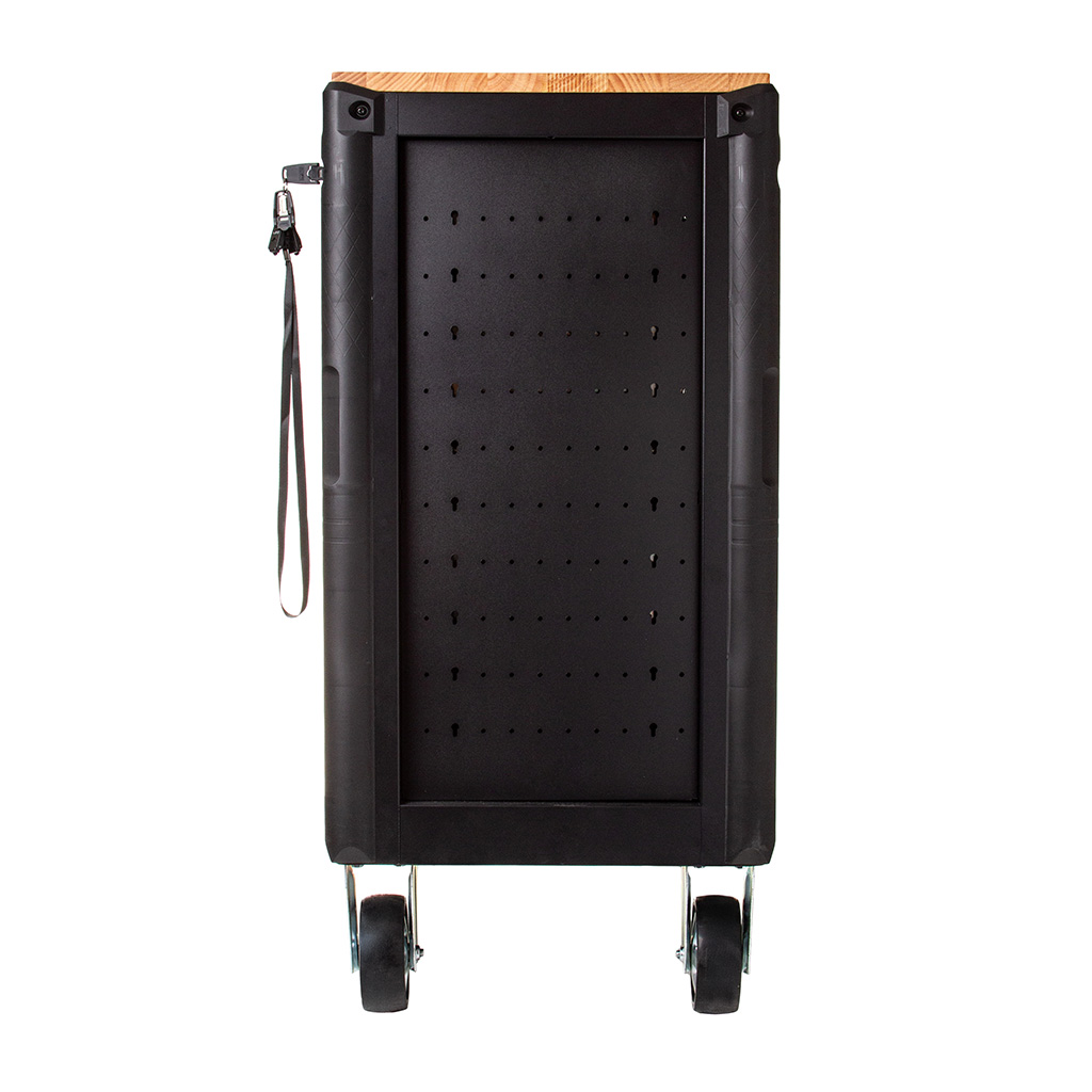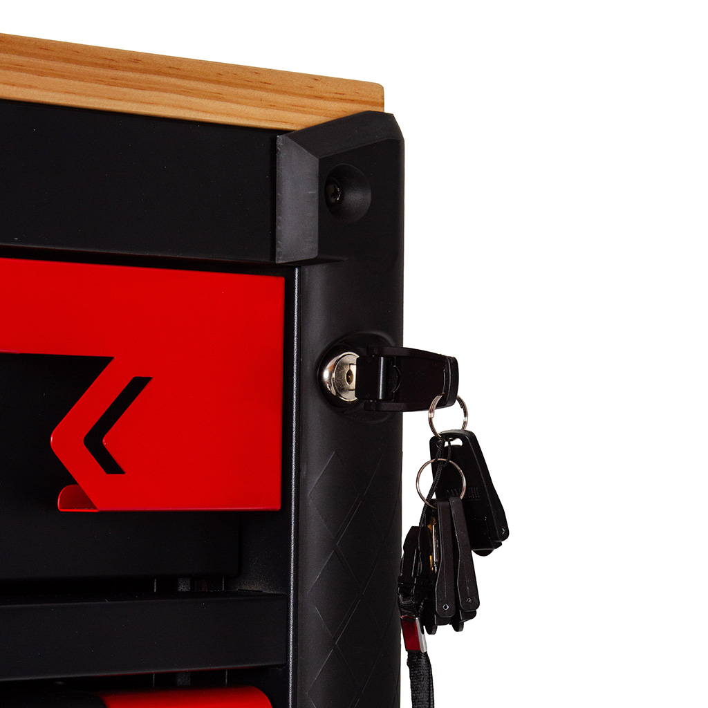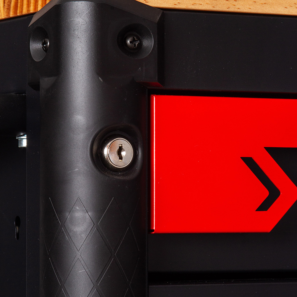 Wyposażona w centralny zamek, który umożliwia jednoczesne zabezpieczenie wszystkich szuflad oraz schowków przed przypadkowym otwarciem i ich bezproblemowy transport.