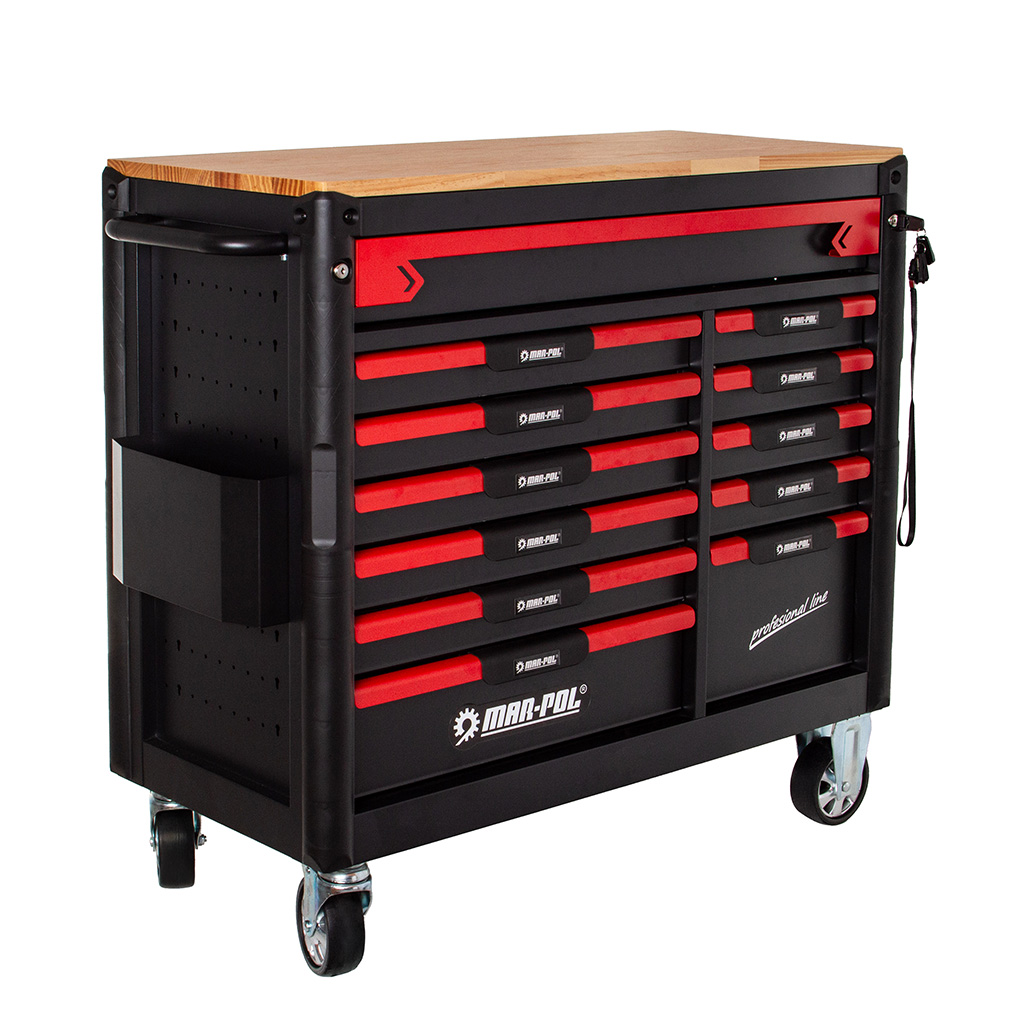 Profesjonalna szafka warsztatowa wyposażona w 12 szuflad na łożyskach kulkowych.