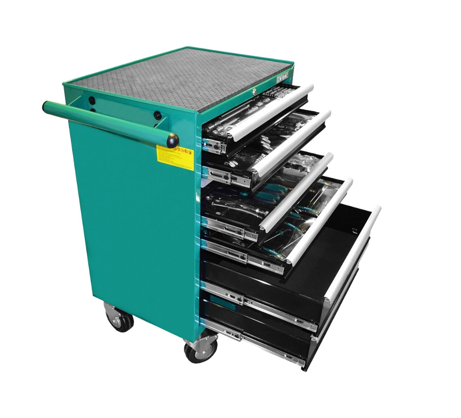 Szafka posiada 7 praktycznych szuflad na narzędzia, zamykanych za pomocą kluczyka oraz dodatkowy również zamykany schowek boczny.