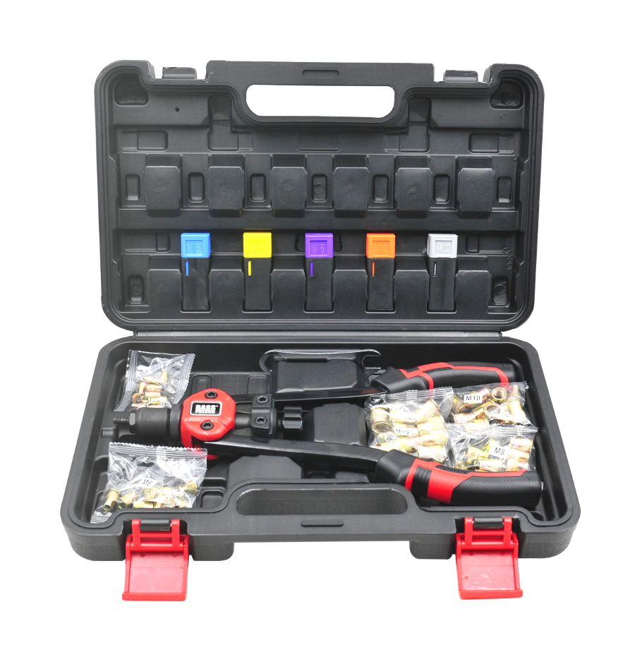 Nitownica ręczna do nitonakrętek współpracuje z nitami wykonanymi z następujących materiałów: Nitownica przeznaczona jest do pracy w warunkach serwisowych. Nitownica posiada 5 rozmiarów końcówek dostosowanych do nitonakrętek. Umożliwia wykonanie połączenia nitowego z gwintem wewnętrznym. Gumowane rękojeści i długie ramiona oraz znakomite wyważenie narzędzia poprawiają jego ergonomię pracy. DANE TECHNICZNE: ✔️ długość nitownicy - 330mm ✔️ długość gwintu - 0-8mm ✔️ zakres nitonakrętek - M5, M6, M8, M10, M12 Po 10 sztuk nitonakrętek: M5, M6, M8, M10, M12