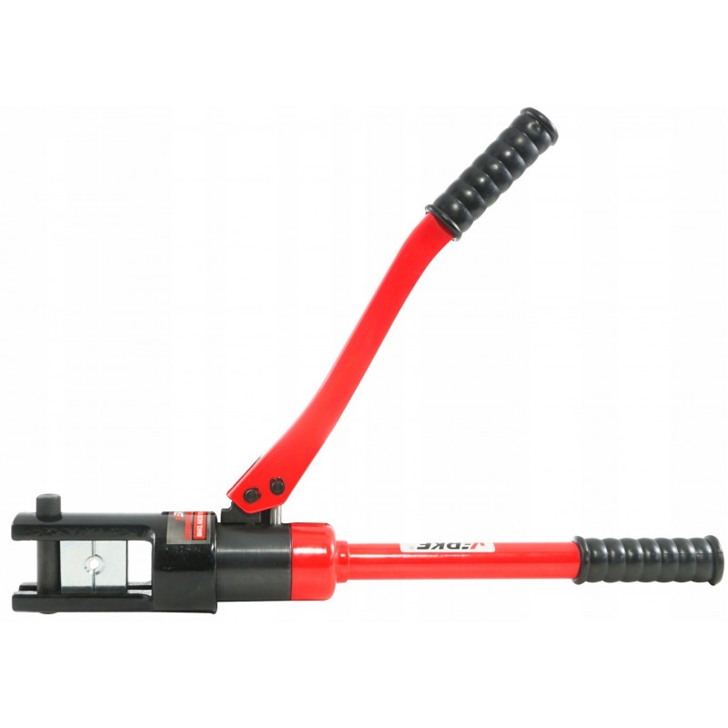Praska ręczna z siłownikiem hydraulicznym. Przeznaczona do zaciskania końcówek na przewodach elektrycznych lub do zaciskania lin. Dzięki siłownikowi hydraulicznemu zaciskanie dużych końcówek nie wymaga wysiłku. Praska posiada obrotową głowicę. Długość zaciskarki około 47cm. Matryce w zestawie: