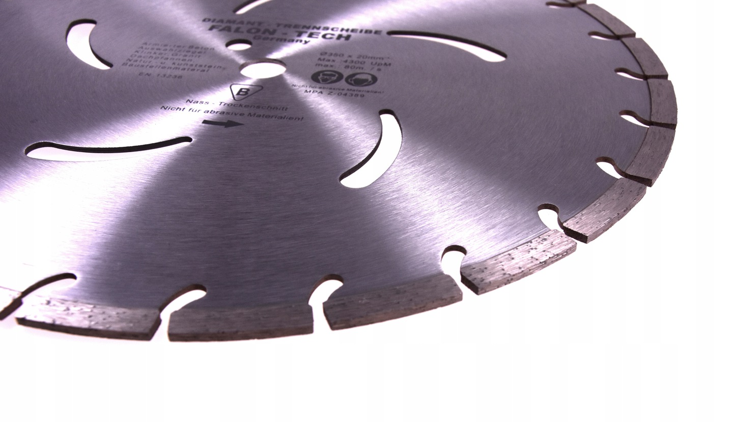 Tarcza diamentowa, marki FALON-TECH służy do cięcia twardych materiałów budowlanych. Najnowsza technologia produkcji zapewnia dłuższa żywotność tarczy i szybszą pracę. Specjalny kształt obrzeża tarczy gwarantuje większą szybkość cięcia w najtwardszych materiałach bez utraty jakości wykończenia. Można używać jej między innymi do cięcia takich twardych materiałów jak granit, marmur czy też twardy beton. Tarcza posiada ostrze segmentowe, które ułatwia usuwanie urobku oraz pozwala na łatwą pracę w twardym, agresywny podłożu. Tarcze FALON-TECH stanowią najlepszy wybór podczas najbardziej wymagających prac. Tarcza do cięcia na sucho i jak i na mokro.