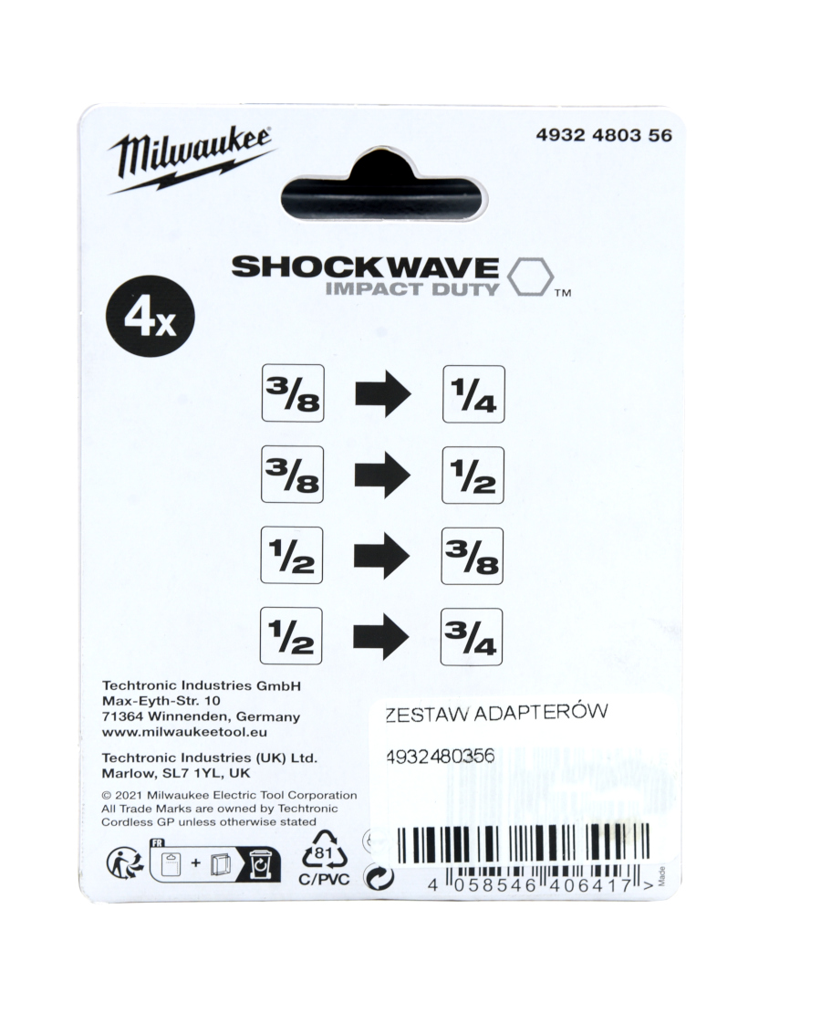 Wysokiej jakości zestaw redukcji udarowych firmy Milwaukee®, wykonane ze stali SHOCKWAVE™ IMPACT DUTY (Cr-Mo). Charakteryzuje się wysoką trwałością oraz wytrzymałością. Na redukcjach jest wytłoczony rozmiar dla łatwej identyfikacji. Dzięki marce Milwaukee otrzymujesz wysoką jakość, na której możesz polegać. Uczyń swoją pracę łatwiejszą i szybszą dzięki temu praktycznemu zestawowi adapterów do klucza udarowego.》》》 ZESTAW ADAPTERÓW REDUKCJI UAROWYCH 4szt MILWAUKEE ® 4932480356 《《《