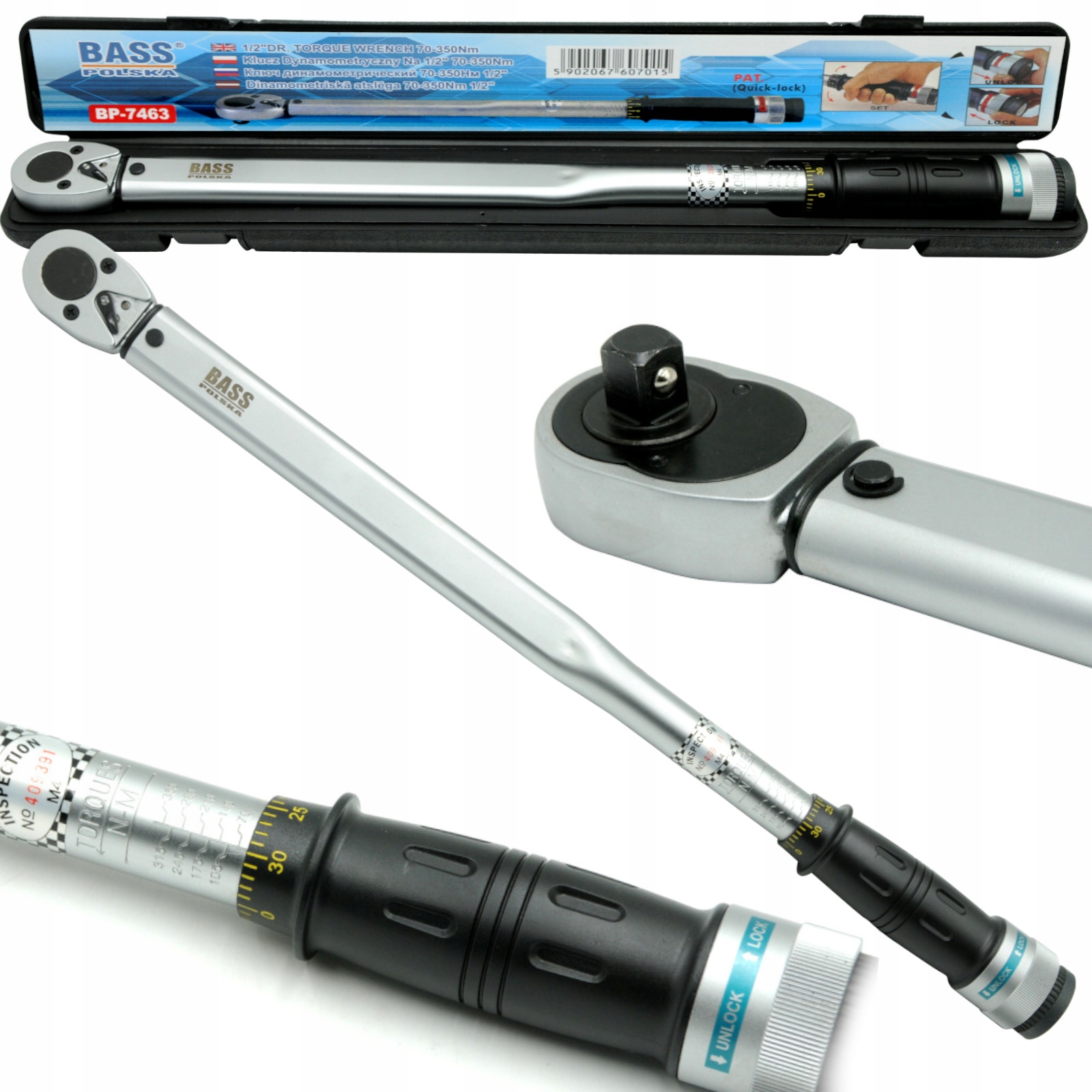 ✔️ Klucz dynamometryczny z mocowaniem 1/2" służący do dokręcania śrub, nakrętek i połączeń gwintowych z dokładnie określonym momentem siły. ✔️ Klucz wykonany z mocnej, odpornej na uszkodzenia mechaniczne, stali CrV. ✔️ Klucz wyposażony w mechaniczny naciąg zapadki dynamometrycznej, która po osiągnięciu żądanej siły dokręcania przeskakuje o jeden ząbek. ✔️ Tryby dwudziestocztero zębowe ze skokiem zabieraka co piętnaście stopni. ✔️ Regulacja momentu siły, umieszczona w rączce klucza, następuje po obrocie rękojeści. ✔️ Po ustawieniu wybranego momentu dokręcenia, klucz dynamometryczny blokuje się zabezpieczeniem na końcu rękojeści. ✔️ Klucz posiada dokładność +/- 4% i regulowaną, profilowaną rączkę w celu zwiększenia komfortu pracy operatora. DANE TECHNICZNE:》》》KLUCZ DYNAMOMETRYCZNY 1/2" 70-350Nm BASS POLSKA ® BP-7463《《《