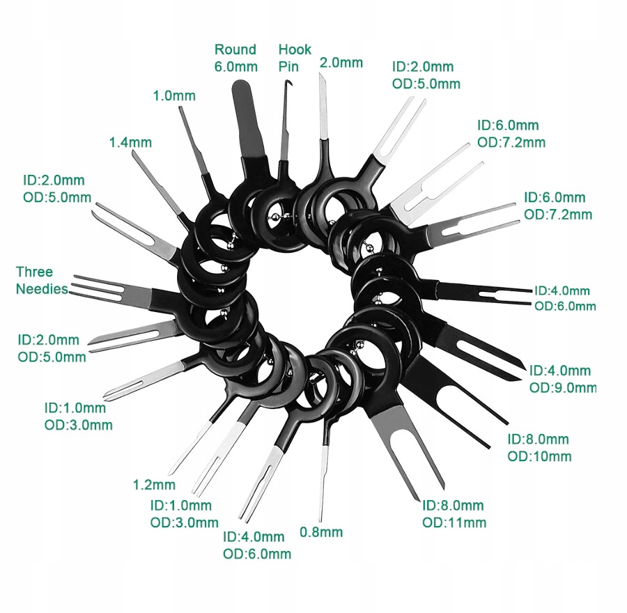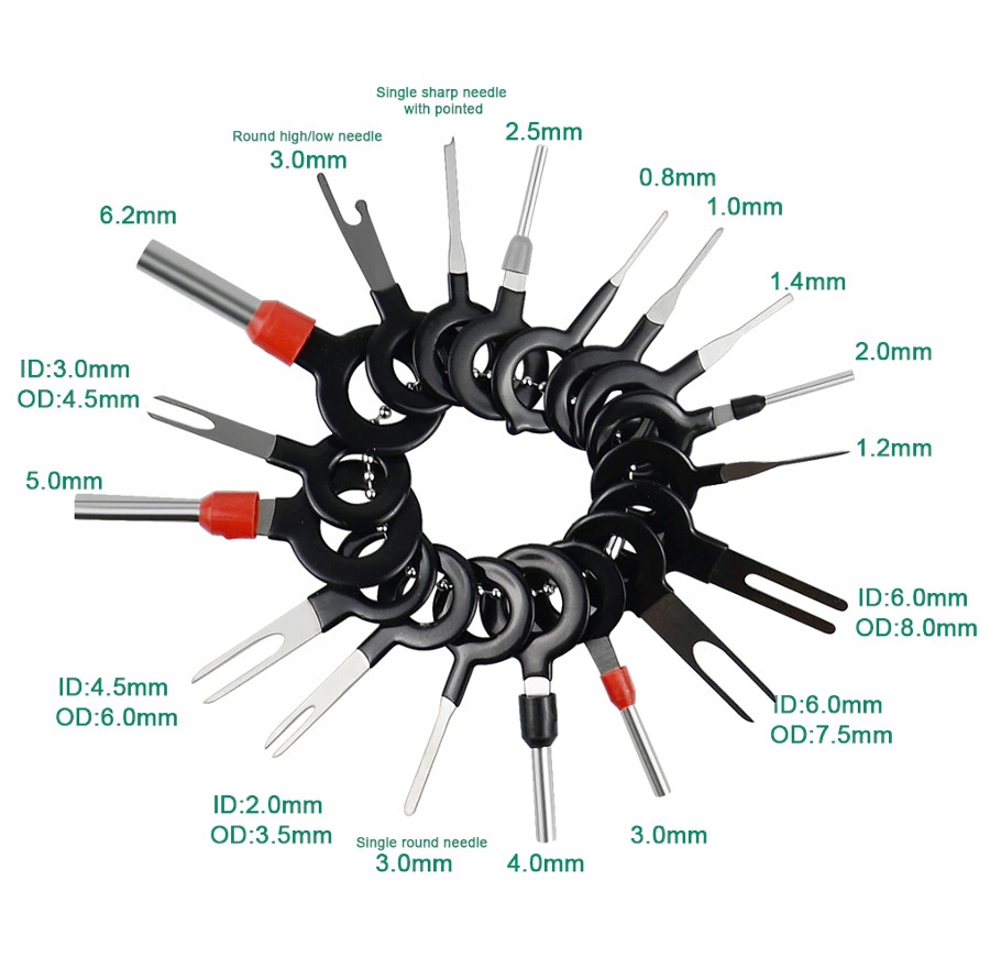 Zestaw 38 kluczy do demontażu pinów, konektorów. Przydatny przy przeróbkach i naprawach instalacji elektrycznej w samochodach, motocyklach, sprzęcie RTV i AGD, itp. Cechy: ✅ DANE TECHNICZNE: