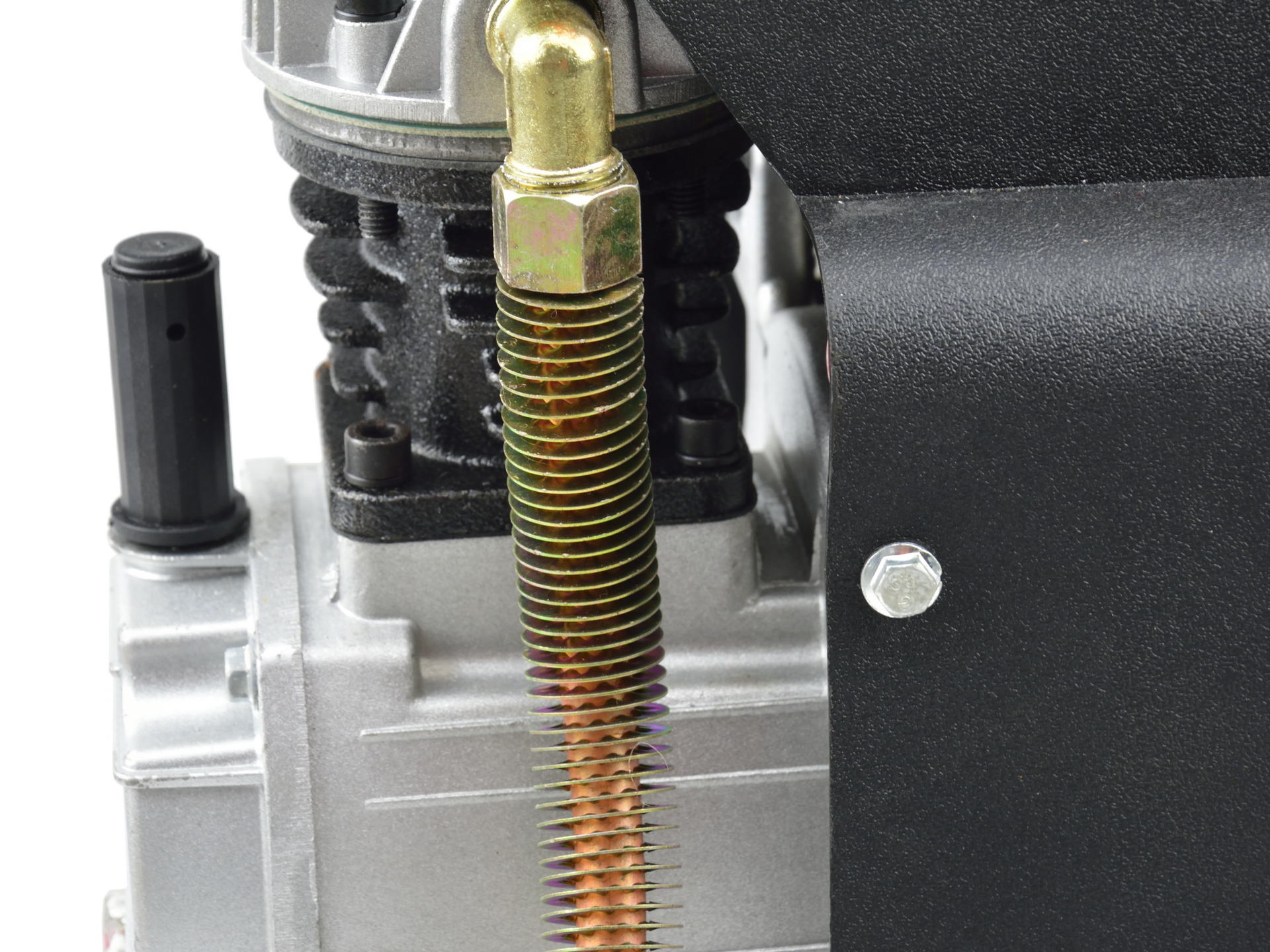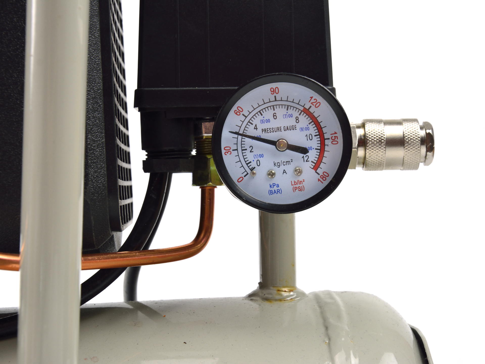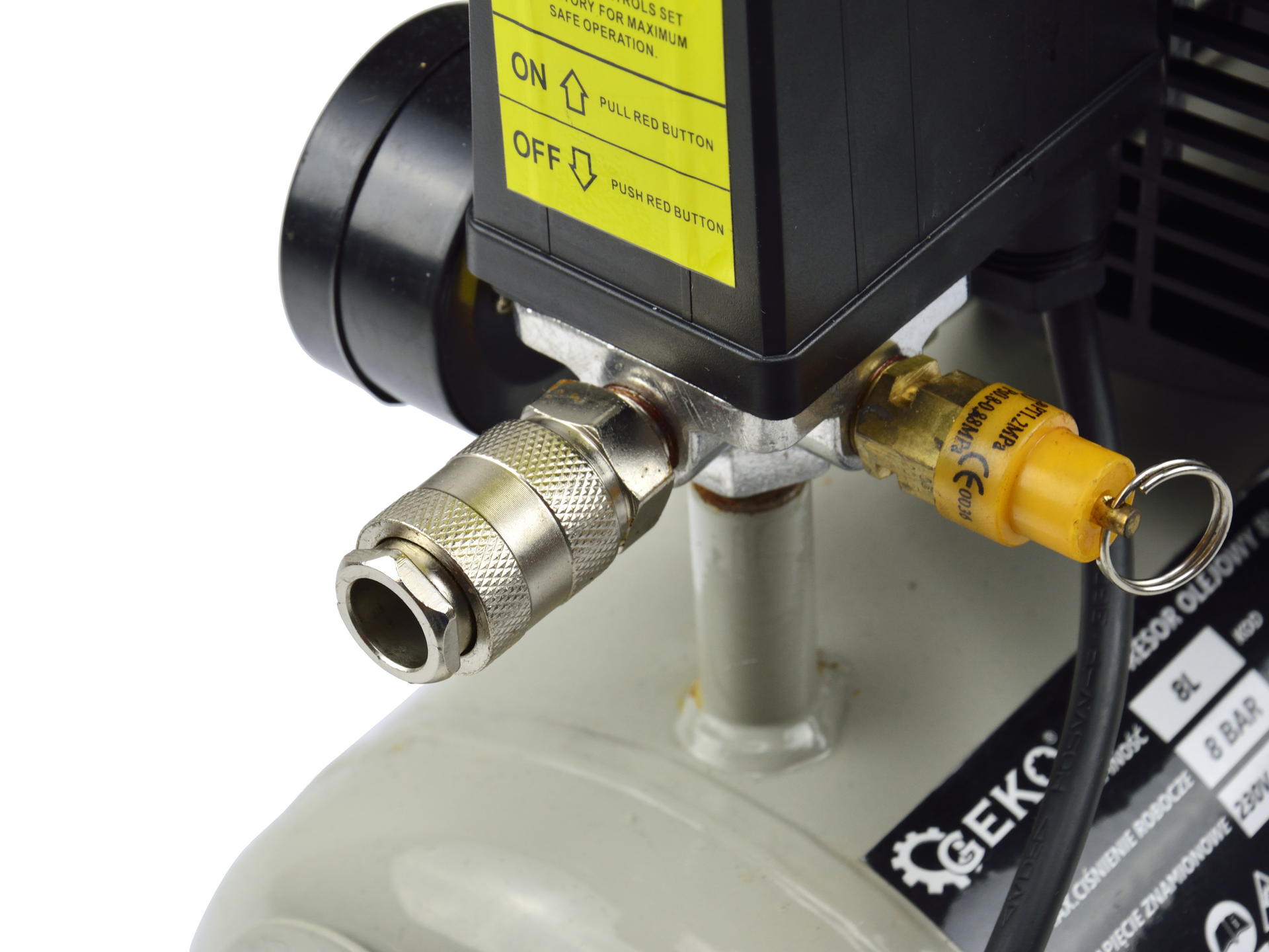 Kompresor olejowy z wydajnym silnikiem o mocy 1 KM i pojemności zbiornika 8 litrów. Wyposażony w reduktor ciśnienia, który pozwala na dostosowanie wartości ciśnienia w zbiorniku.