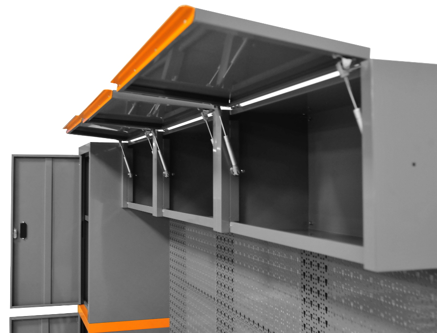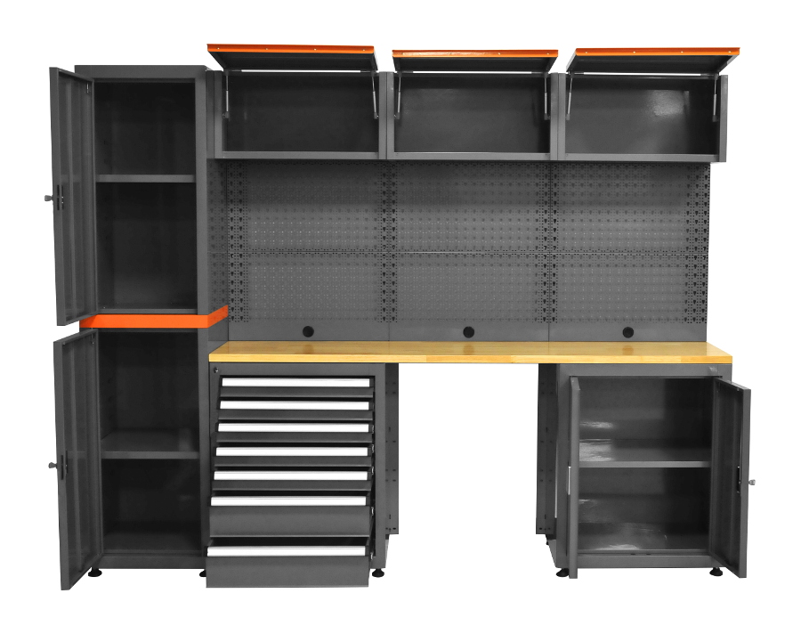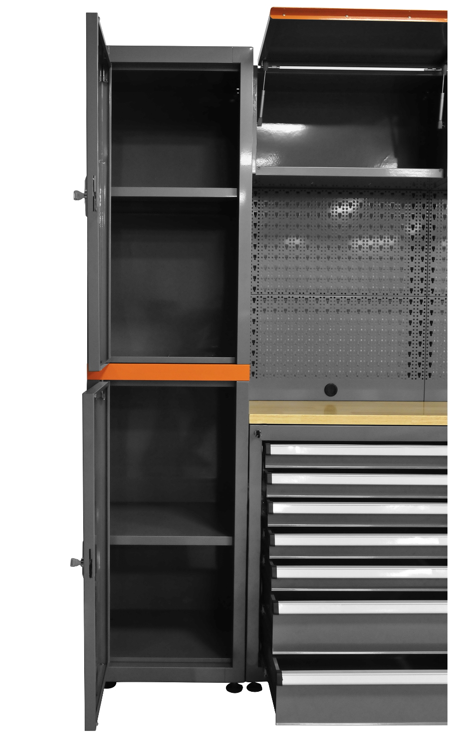 Profesjonalny regał warsztatowy wykonany ze stali malowanej proszkowo, wykończony twardym drewnianym blatem roboczym. Szafki w kolorze szaro-pomarańczowym, łatwe w utrzymaniu czystości, szuflady na solidnych prowadnicach, boczne szafki oraz dolna szafka zamykana na klucz, szuflady z zamkiem centralnym na kluczyk. Drewniany blat roboczy o wymiarach 2050x435mm i grubości 30mm znajduję się na wysokości 900mm od ziemi. W zestawie znajdą Państwo również 6 płyt perforowanych, tworzą one łącznie prostokąt o wymiarach 2050x760mm. Zastosowanie haczyków (brak w zestawie) umożliwi zawieszenie najpotrzebniejszych narzędzi, które będą zawsze "pod ręką". Prześwit między szafkami wynosi 68cm, jest tutaj dość miejsca na krzesło bądź taboret. ✅ Wymiary: Dolna szafka posiada jedną półkę o wymiarach 680x430mm. Wysokość od spodu do półki 350mm, od półki do blatu 340mm. Szafka z lewej strony posiada 7 szuflad o wymiarach wewnętrznych 57x40cm Trzy wiszące szafki wyposażone w siłowniki zapewniaja wygodę i komfort pracy. ✅ Wymiary wewnętrzne półek : Obie zewnętrzne, pionowe szafki posiadają jedną półkę, którą można zamocować w różnych (sześciu) pozycjach. Wysokość wewnętrzna szafki bez półki 900mm.