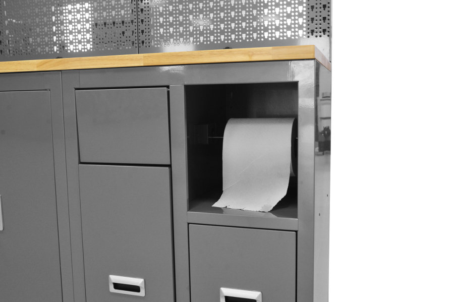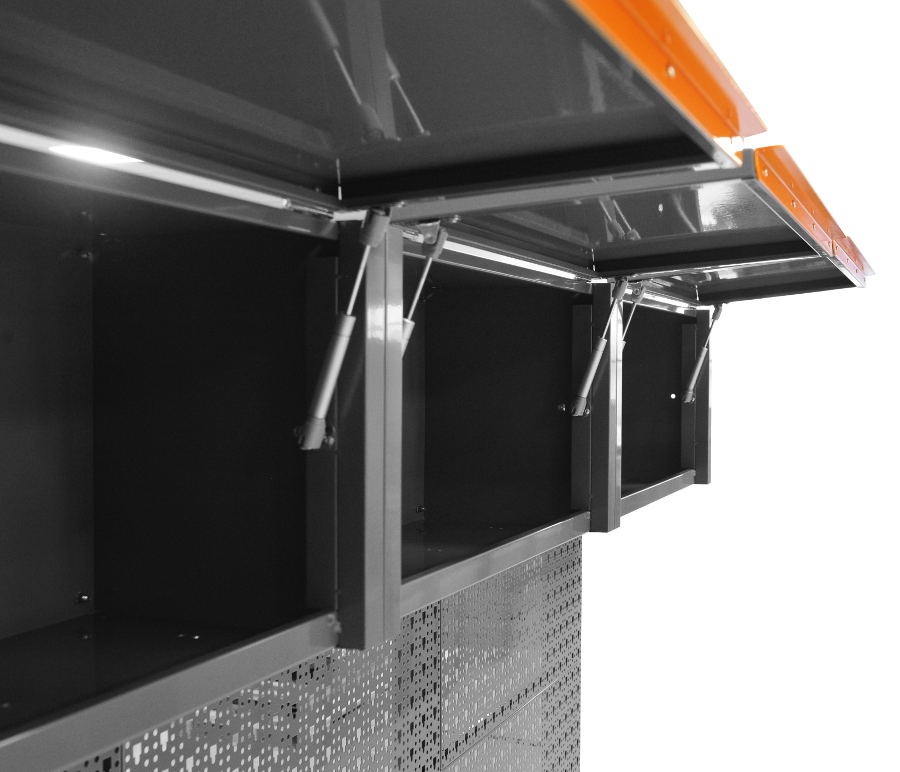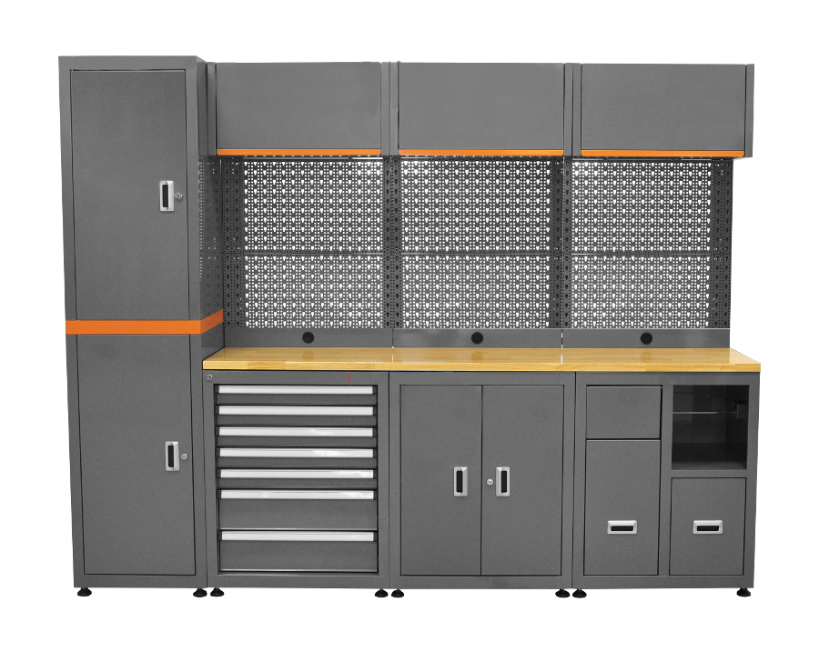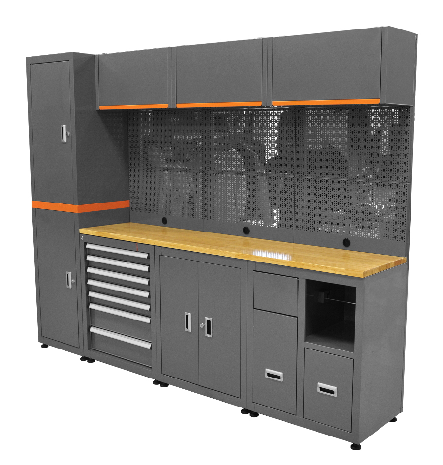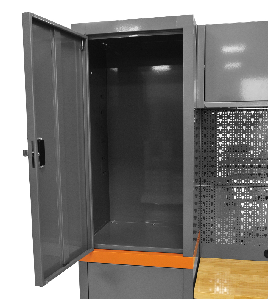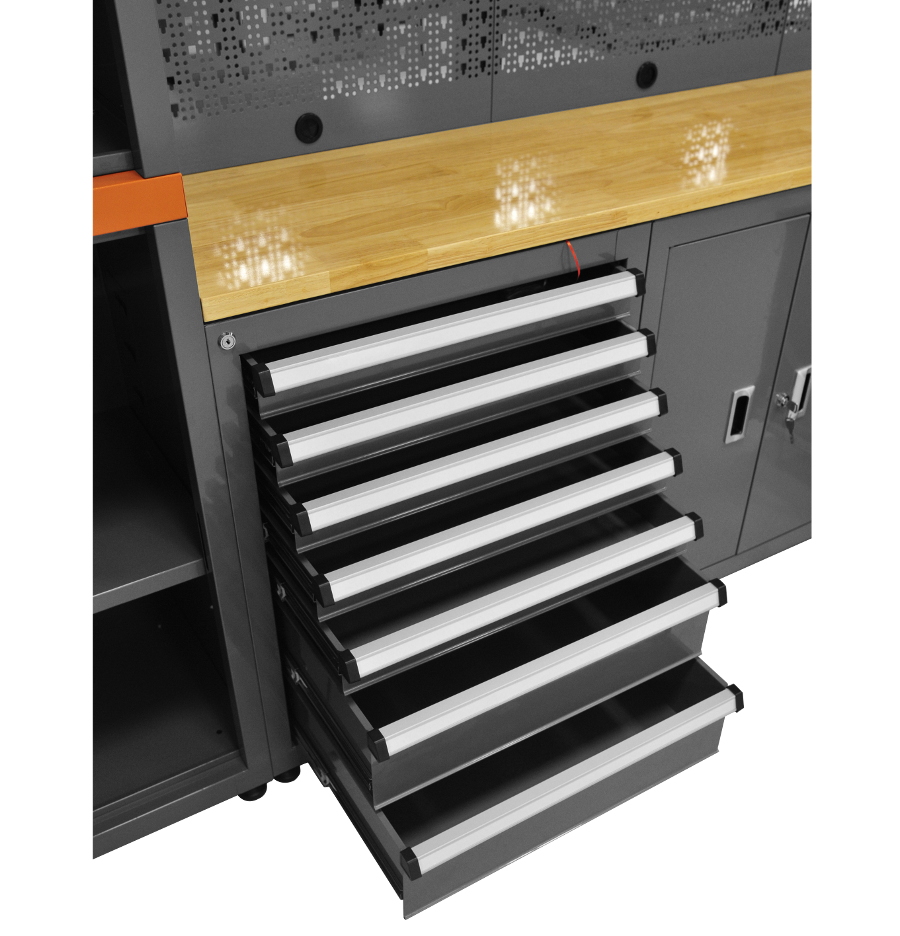 Profesjonalny regał warsztatowy wykonany ze stali malowanej proszkowo, wykończony twardym drewnianym blatem roboczym. Szafki w kolorze szaro-pomarańczowym, łatwe w utrzymaniu czystości, szuflady na solidnych prowadnicach, boczne szafki oraz dolna szafka zamykana na klucz, szuflady z zamkiem centralnym na kluczyk. Drewniany blat roboczy o wymiarach 2050x435mm i grubości 30mm znajduję się na wysokości 900mm od ziemi. W zestawie znajdą Państwo również 6 płyt perforowanych, tworzą one łącznie prostokąt o wymiarach 2050x760mm. Zastosowanie haczyków (brak w zestawie) umożliwi zawieszenie najpotrzebniejszych narzędzi, które będą zawsze "pod ręką". ✅ Wymiary: Dolna śdorkowa szafka posiada jedną półkę o wymiarach 680x430mm. Wysokość od spodu do półki 350mm, od półki do blatu 340mm. Szafka dolna z lewej strony posiada 7 szuflad o wymiarach wewnętrznych 57x40cm Trzy wiszące szafki wyposażone w siłowniki zapewniaja wygodę i komfort pracy. ✅ Wymiary wewnętrzne półek : Obie zewnętrzne, pionowe szafki posiadają jedną półkę, którą można zamocować w różnych (sześciu) pozycjach. Wysokość wewnętrzna szafki bez półki 900mm. Z prawej strony znajduje się miejsce na kosz z uchylna klapką. Szuflada na kosz posiada wymiary 420x250x500mm. Skrajna prawa dolna szuflada ma wymiary 250x420x350mm. W regale znalazło się również miejsce na montaż ręczników papierowych.