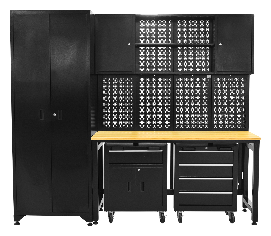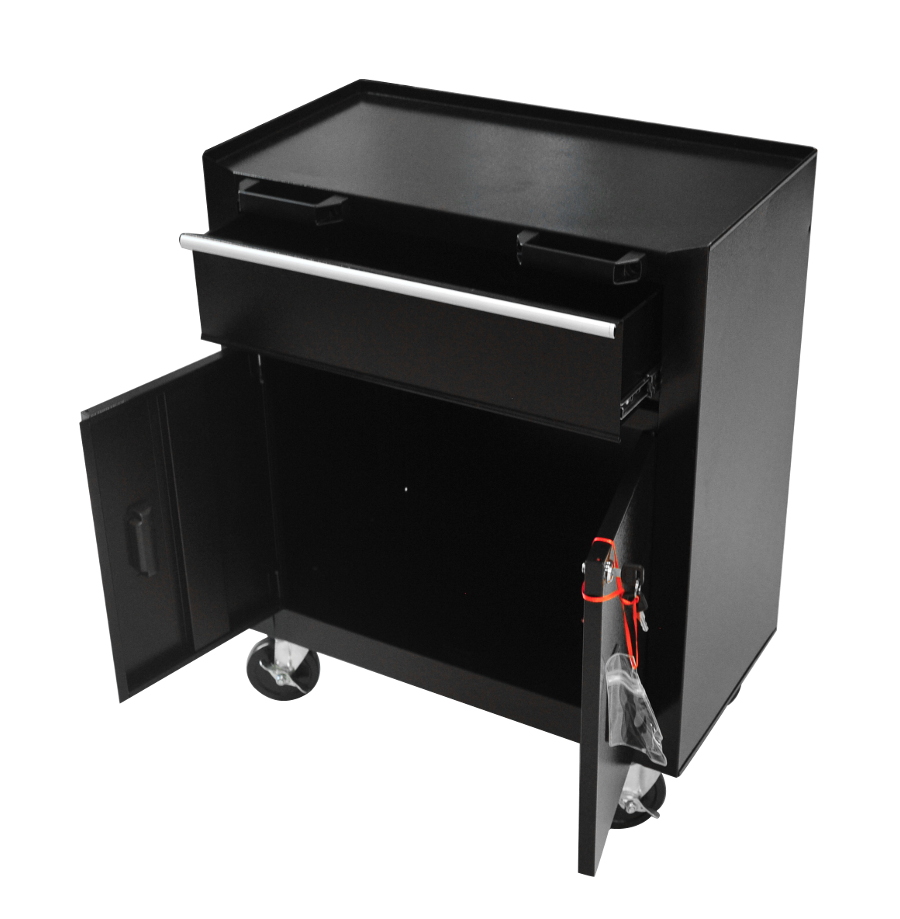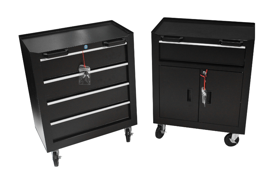 Zestaw został wyposażony w dwa mobilne wózki narzędziowe z szufladami na kółkach, zamykane na kluczyk.