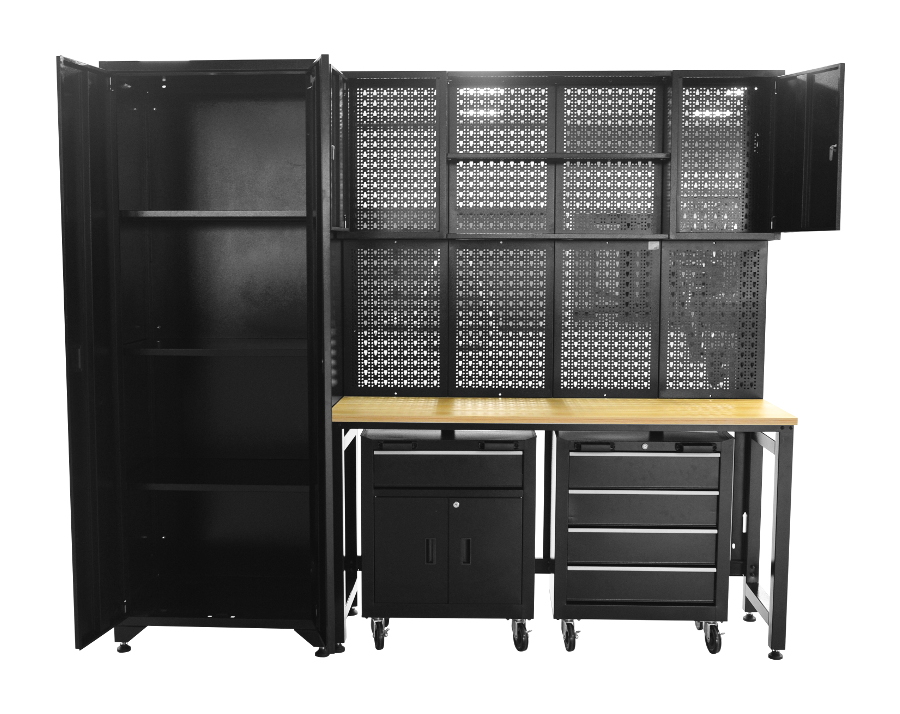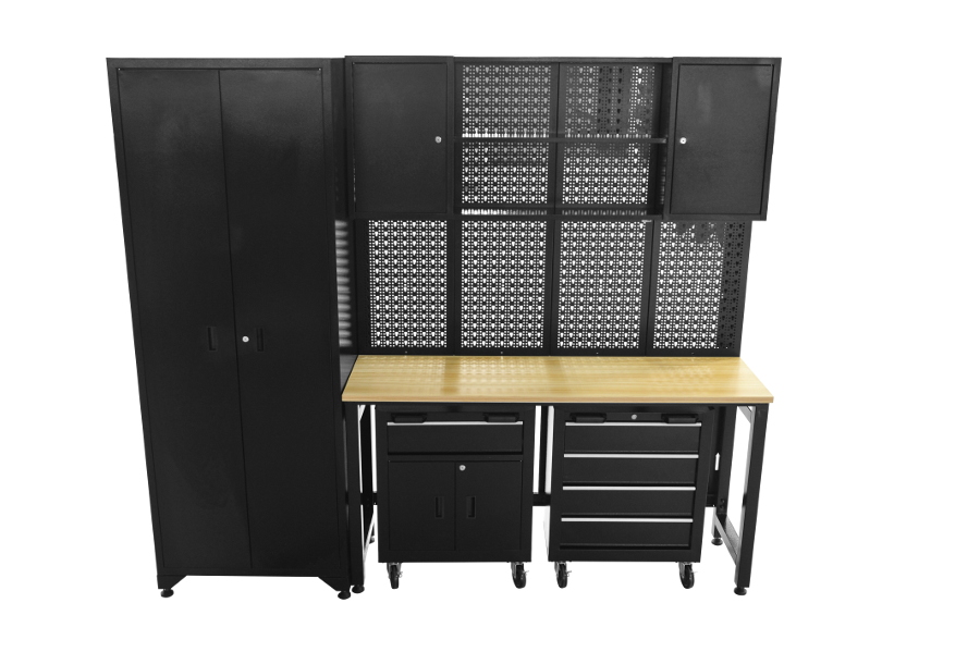 Profesjonalny regał warsztatowy wykonany ze stali malowanej proszkowo, wykończony twardym drewnianym blatem roboczym. Całość w kolorze czarnym, wszystkie szafki zamykane są na kluczyk. Zestaw został wyposażony w dwa mobilne wózki narzędziowe z szufladami na kółkach, zamykane na kluczyk. ✅ Wymiary: Szafa posiada trzy składane półki. Każdą półkę można w łatwy sposób złożyć, pozwala to wykorzystać całe wnętrze szafy. Wysokość wewnętrzna szafy ze złożonymi półkami 1920mm. Drewniany blat roboczy o wymiarach 1600x480mm i grubości 25mm znajduję się na wysokości 86cm od ziemi. W zestawie znajdą Państwo również 6 płyt perforowanych, o wymiarach 40x60cm. Zastosowanie haczyków (brak w zestawie) umożliwi zawieszenie najpotrzebniejszych narzędzi, które będą zawsze "pod ręką". Między górnymi szafkami znajdują się dwie półki 80x17,5cm. Dwie górne szafki o wymiarach 39,5x59,5cm. Zestaw ten został wyposażony w dwa mobilne wózki narzędziowe z czterema dużymi kołami dla łatwiejszego transportu, 2 koła stałe i dwa skrętne z blokadą. Wózek mobilny na kółkach posiada jedna szufladę oraz szafkę z zamkiem. Wózek mobilny na kółkach z czterema szufladami z zamkiem centralnym.