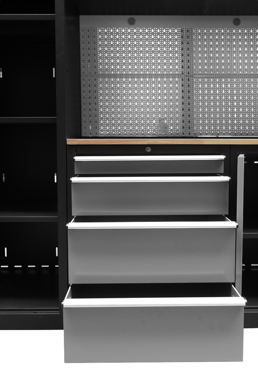 Profesjonalny regał warsztatowy wykonany ze stali malowanej proszkowo, wykończony twardym drewnianym blatem roboczym. Szafa w kolorze szaro-czarnym, łatwa w utrzymaniu czystości, szuflady na solidnych prowadnicach, wszystkie skrzydła zamykane na klucz, szuflady z zamkiem centralnym na kluczyk. ✅ Wymiary: Obie zewnętrzne, pionowe szafki posiadają po 4 półki, które można zamocować w różnych (osiemnastu ) pozycjach. Regał posiada dwie zamykane szafki z szufladami na prowadnicach. Szafka z lewej strony posiada 4 szuflady o wymiarach wewnętrznych 57x39,5cm Szafka z lewej strony posiada 5 szuflad o wymiarach wewnętrznych 57x39,5cm Pomiędzy szafkami z szufladami znadują się półka o wymiarach 680x430mm. Drewniany blat roboczy o wymiarach 2055x435mm i grubości 30mm znajduję się na wysokości 895mm od ziemi. W zestawie znajduje się 20 haczyków, dzięki którym możemy powiesić nasze narzędzia na kratce znajdującej się nad blatem. Trzy wiszące szafki wyposażone w siłowniki zapewniaja wygodę i komfort pracy. ✅ Wymiary wewnętrzne półek :