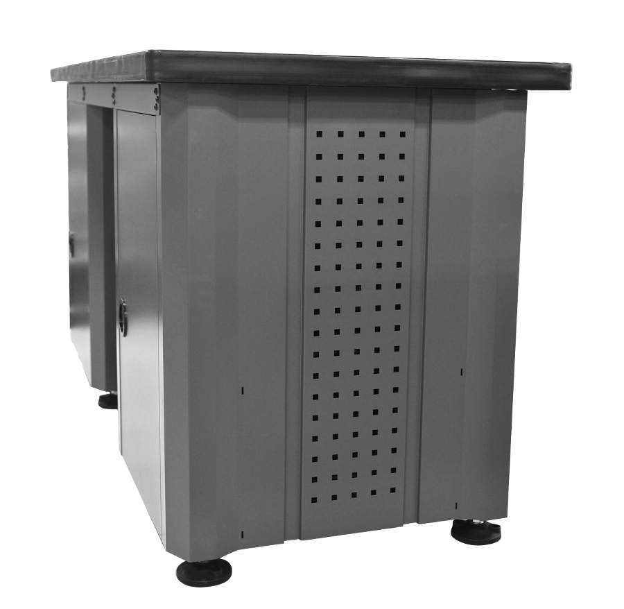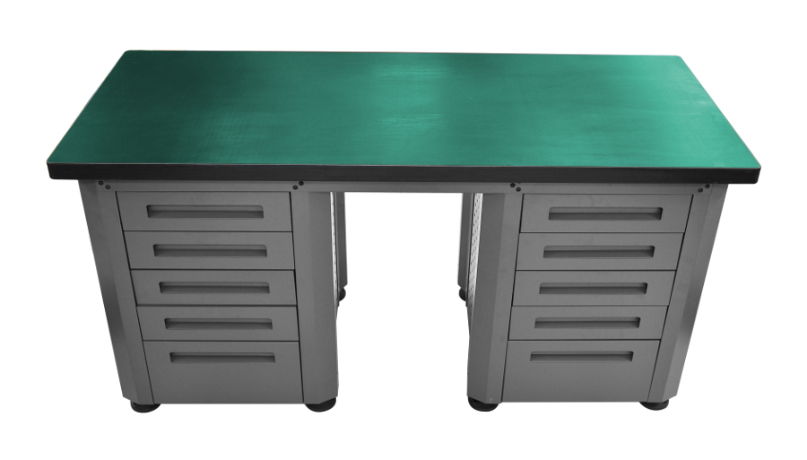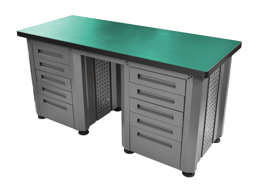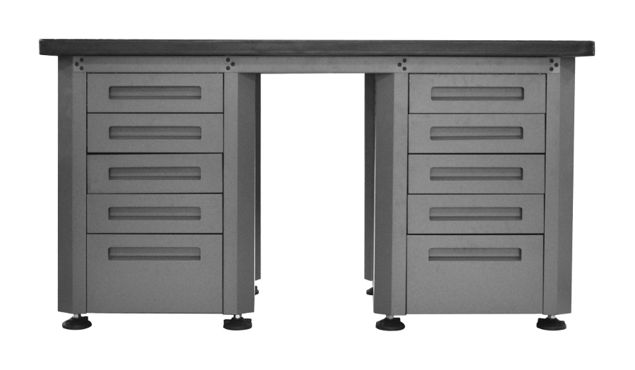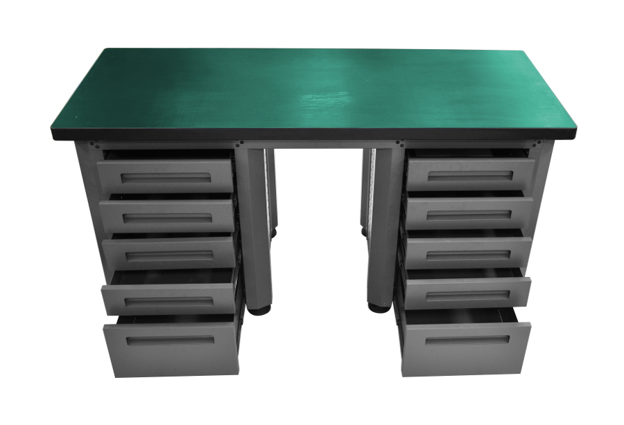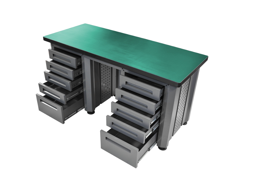 Solidna konstrukcja stołu zapewnia stabilność nawet podczas pracy z ciężkimi przedmiotami, co jest istotne dla bezpieczeństwa i precyzji wykonywanych zadań. Blat roboczy został osadzony na wysokości 90cm. Prześwit pod blatem między szufladami 40cm. Stół został wyposażony w dziesięć pojemnych szuflad do przechowywania narzędzi. Dodatkowo po obu stronach stołu znajdują się kratki na których możemy powiesić dowolne narzędzia. Powierzchnia blatu roboczego została pokryta gumową matą. Szuflady stołu warsztatowego wyłożone są miękkimi matami, które chronią przechowywane narzędzia przed uszkodzeniami ✅ Dane techniczne :
