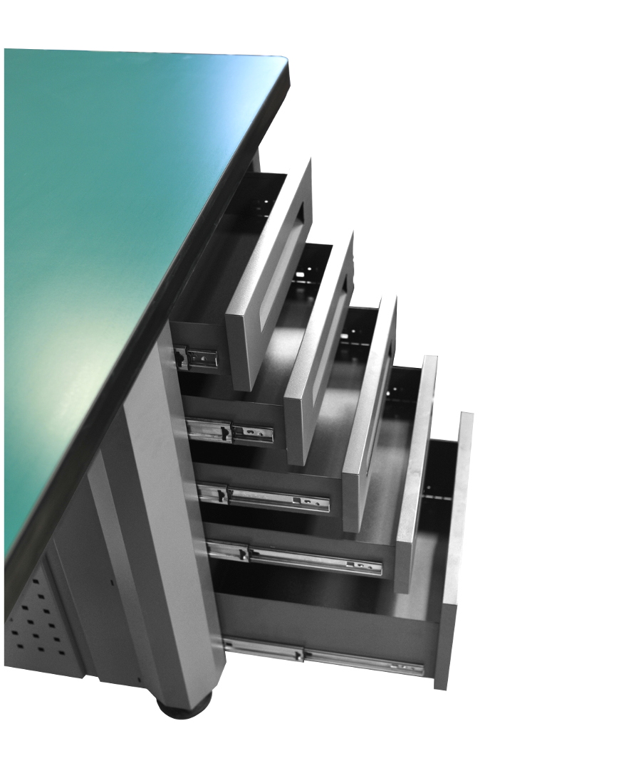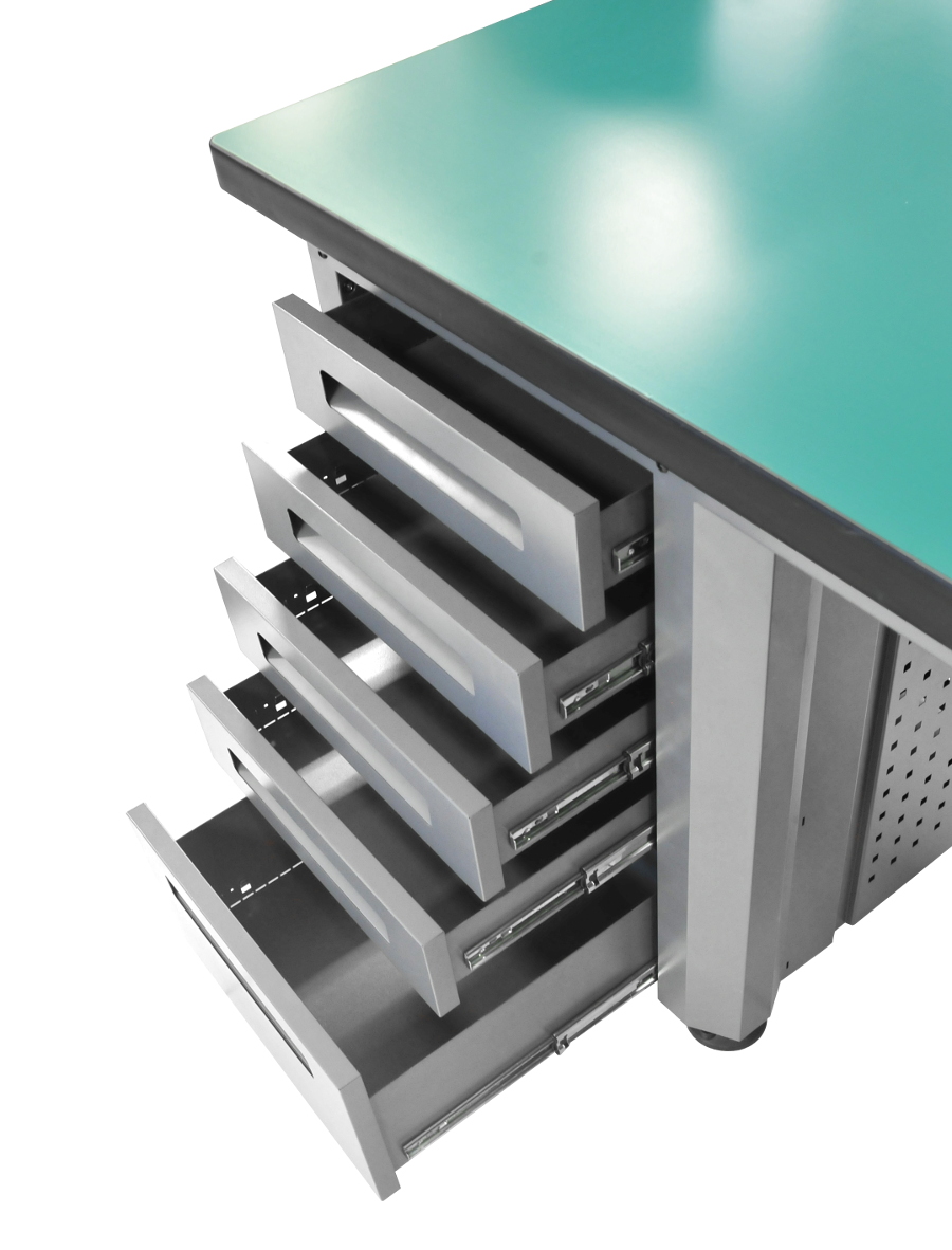 Solidna konstrukcja stołu zapewnia stabilność nawet podczas pracy z ciężkimi przedmiotami, co jest istotne dla bezpieczeństwa i precyzji wykonywanych zadań. Blat roboczy został osadzony na wysokości 90cm. Prześwit pod blatem między szufladami ok 70cm. Stół został wyposażony w dziesięć pojemnych szuflad do przechowywania narzędzi. Dodatkowo po obu stronach stołu znajdują się kratki na których możemy powiesić dowolne narzędzia. Powierzchnia blatu roboczego została pokryta gumową matą. Szuflady stołu warsztatowego wyłożone są miękkimi matami, które chronią przechowywane narzędzia przed uszkodzeniami ✅ Dane techniczne :