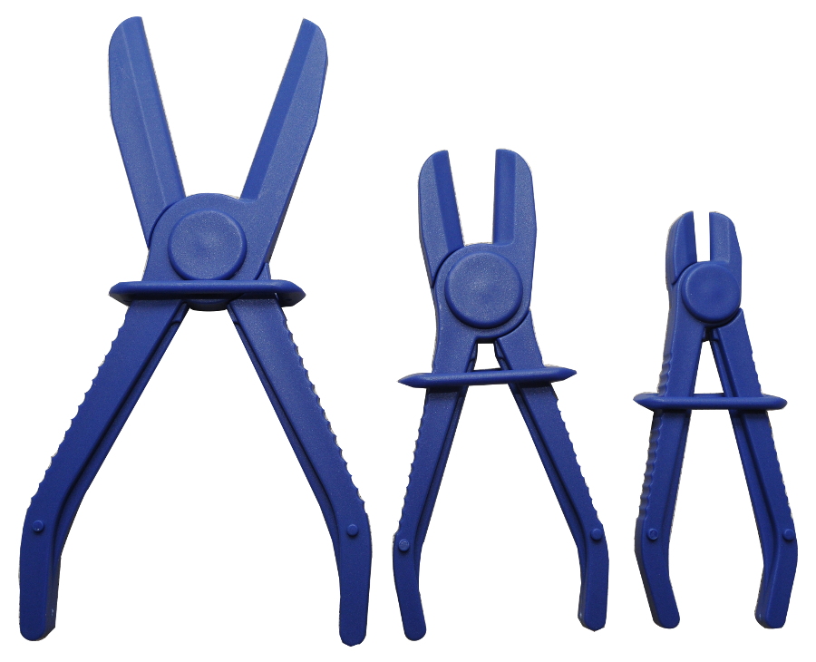 Zestaw szczypiec zaciskowych do przewodów elastycznych. Do przewodów o średnicy do 63.5 mm. Za pomocą szczypiec można zapobiec wypłynięciu płynów z przewodów chłodniczych, hamulcowych, itp. Cechy produktu