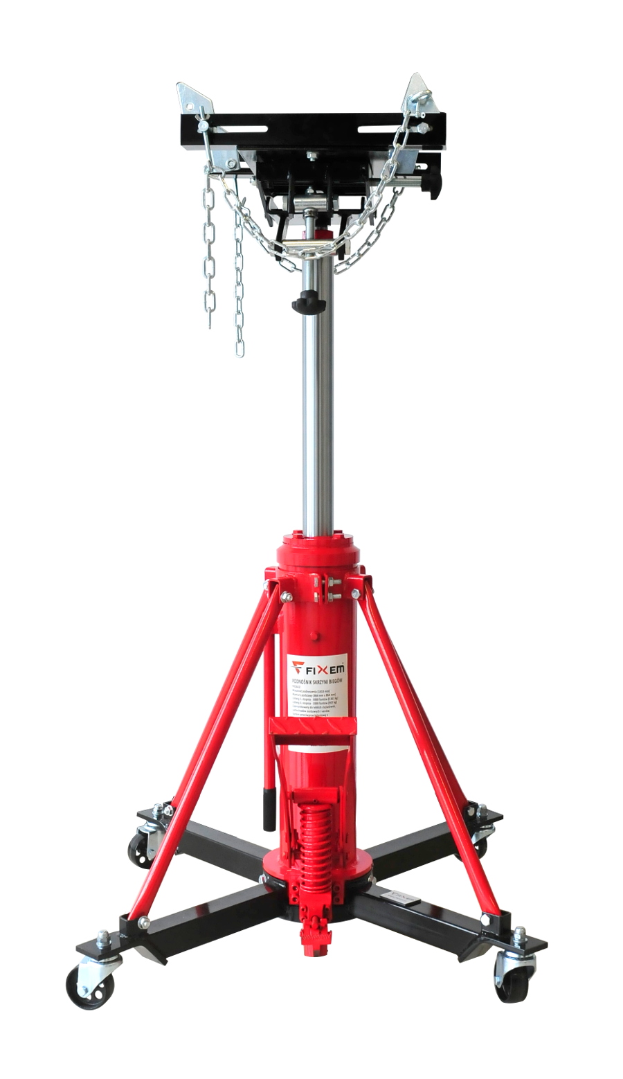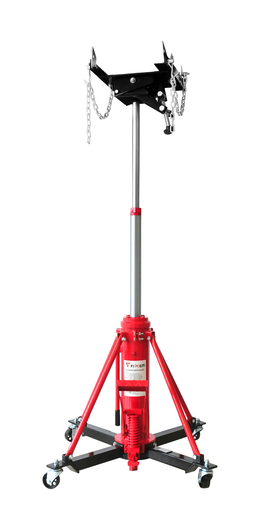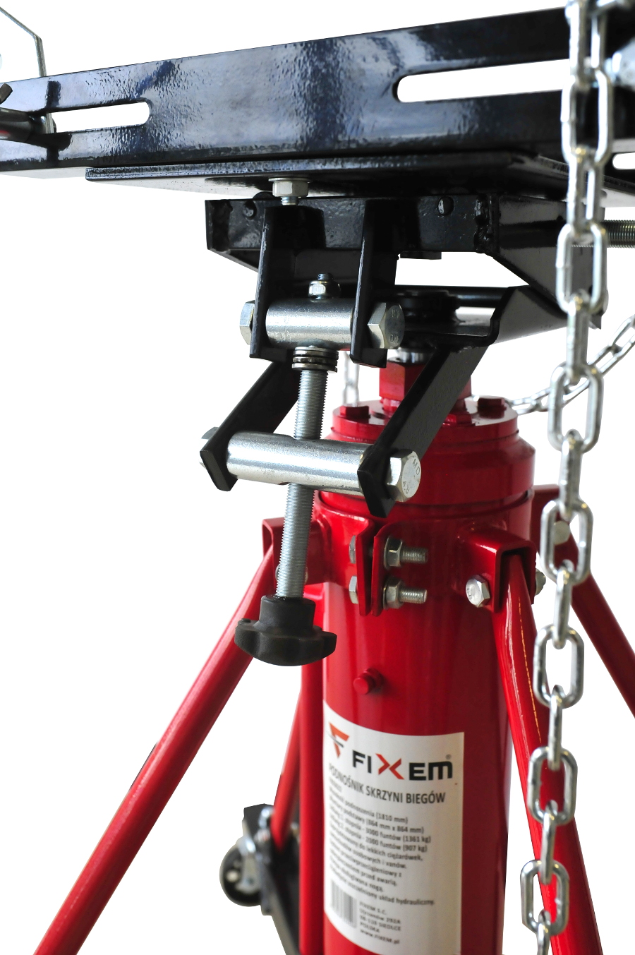 Solidny podnośnik warsztatowy zaprojektowany z myślą o wygodnym i bezpiecznym demontażu oraz montażu skrzyń biegów i innych elementów układu napędowego. Dzięki dwustopniowemu mechanizmowi podnoszenia możliwa jest praca w zakresie od 860 mm do 1800 mm (plus wysokość siodła), co pozwala dopasować sprzęt do różnych typów pojazdów i zadań serwisowych. Wzmocniona konstrukcja zapewnia stabilną pracę podczas wymiany skrzyni biegów jak również skrzyń transportowych, a nawet zbiorników paliwa itp. Podnośnik został zaprojektowany do pracy z samochodami osobowymi, vanami oraz lekkimi ciężarówkami. Pierwszy siłownik (tłok) może unieść ciężar do 1360 kg, natomiast drugi siłownik ma maksymalny udźwig 900 kg. Podnośnik posiada czterokierunkowe, w pełni regulowane siodło, które zostało zaprojektowane z myślą o obsłudze automatycznych skrzyń biegów oraz zespołów napędowych w samochodach osobowych i lekkich pojazdach dostawczych. Regulacja stołu odbywa się za pomocą dużych, wygodnych pokręteł. Podnośnik wyposażony jest w pompkę nożną umożliwiającą wygodne podnoszenie oraz dźwignię nożną do kontrolowanego opuszczania. Dzięki dwustopniowemu tłoczysku proces unoszenia odbywa się szybko i sprawnie.