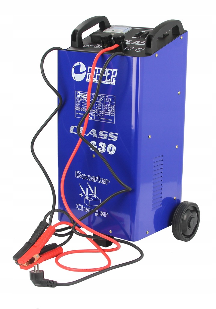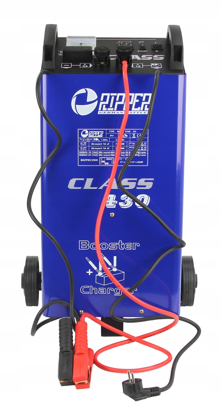 Prostownik z rozruchem to urządzenie niezbędne w każdym garażu, warsztacie, a także w serwisach samochodowych oraz gospodarstwach rolnych. Prostownik cechuje się solidną metalową obudową odporną na uszkodzenia mechaniczne oraz zużycie. Posiada on wbudowany amperomierz, który umożliwia kontrolę ładowania oraz dokładny odczyt chwilowego natężenia prądu. Amperomierz pozwala również na określenie poziomu naładowania akumulatora. Prostownik CLASS 430 z funkcją rozruchu to profesjonalne narzędzie do ładowania i wspomagania rozruchu akumulatorów ołowiowo-kwasowych o napięciu 12 V; 24 V i pojemności akumulatorów od 40 Ah do 400 Ah.》》》 PROSTOWNIK Z ROZRUCHEM RIPPER CLASS 430 12/24V M82512R 《《《