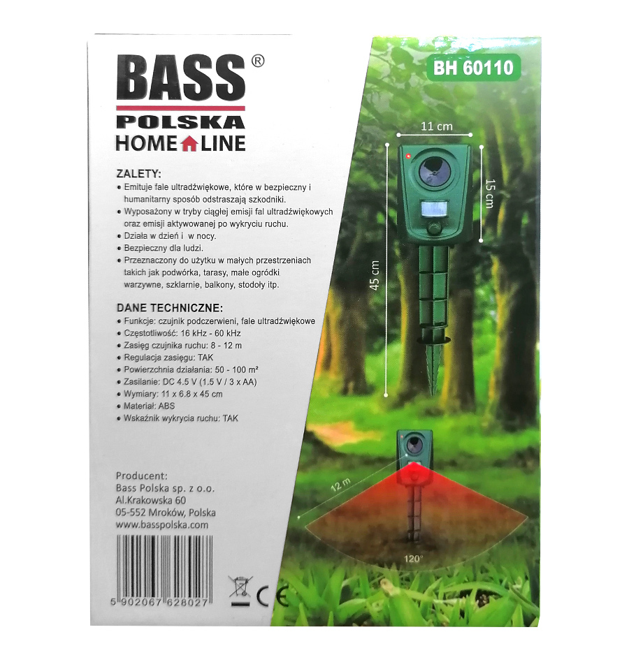 Skuteczna ochrona przed niechcianymi zwierzętami. Odstraszacz zwierząt Bass Polska to idealne rozwiązanie dla osób, które chcą zabezpieczyć swoje otoczenie przed szkodnikami, takimi jak gryzonie, ptaki, kuny, lisy, dziki, zające, psy, koty i inne niepożądane zwierzęta. Wysoka skuteczność fal ultradźwiękowych Dzięki wykorzystaniu fal ultradźwiękowych o częstotliwości 16 kHz - 60 kHz, nasz odstraszacz jest niezwykle skuteczny w odstraszaniu różnych gatunków zwierząt. Te ultradźwięki są prawie niezauważalne dla ludzkiego ucha, ale skutecznie odstraszają zwierzęta. Regulacja zasięgu i wskaźnik wykrycia ruchu Odstraszacz szkodników Bass Polska jest wyposażony w regulację zasięgu, umożliwiającą dostosowanie działania urządzenia do indywidualnych potrzeb. Dodatkowo, dzięki wskaźnikowi wykrycia ruchu, odstraszacz reaguje tylko na aktywność zwierząt, co minimalizuje przypadkowe uruchamianie się urządzenia. Duży zasięg czujnika ruchu. Zasięg czujnika ruchu wynoszący 8 - 12 metrów pozwala na skuteczną ochronę obszaru wokół Twojego domu, ogrodu lub innej przestrzeni. Nie martw się o niepożądane zwierzęta w pobliżu Twojego majątku. Wygodne zasilanie i długotrwałe działanie Odstraszacz ultradźwiękowy zasilany jest łatwo dostępnymi bateriami AA, dzięki czemu możesz go łatwo i szybko uruchomić bez konieczności korzystania z kabli i gniazdek.( baterii nie ma w zestawie ) Niskie zużycie energii zapewnia długotrwałe działanie, oszczędzając Twój czas i wysiłek. Wytrzymała konstrukcja i łatwa instalacja. Wykonany z trwałego materiału ABS, odstraszacz jest odporny na warunki atmosferyczne. Dzięki prostemu projektowi i kompaktowym wymiarom (11 x 6.8 x 45 cm), instalacja jest łatwa i nie zajmuje dużo miejsca. Odstraszacz zwierząt ultradźwiękowy to niezawodne narzędzie dla wszystkich, którzy pragną skutecznie ochronić swoje otoczenie przed szkodnikami, ptakami i gryzoniami. Z łatwością zastosujesz go w swoim ogrodzie, na balkonie czy w piwnicy, a skuteczność działania i wygoda użytkowania sprawią, że będziesz mógł cieszyć się spokojem bez obaw o niechcianych intruzów. ✅ Dane techniczne :