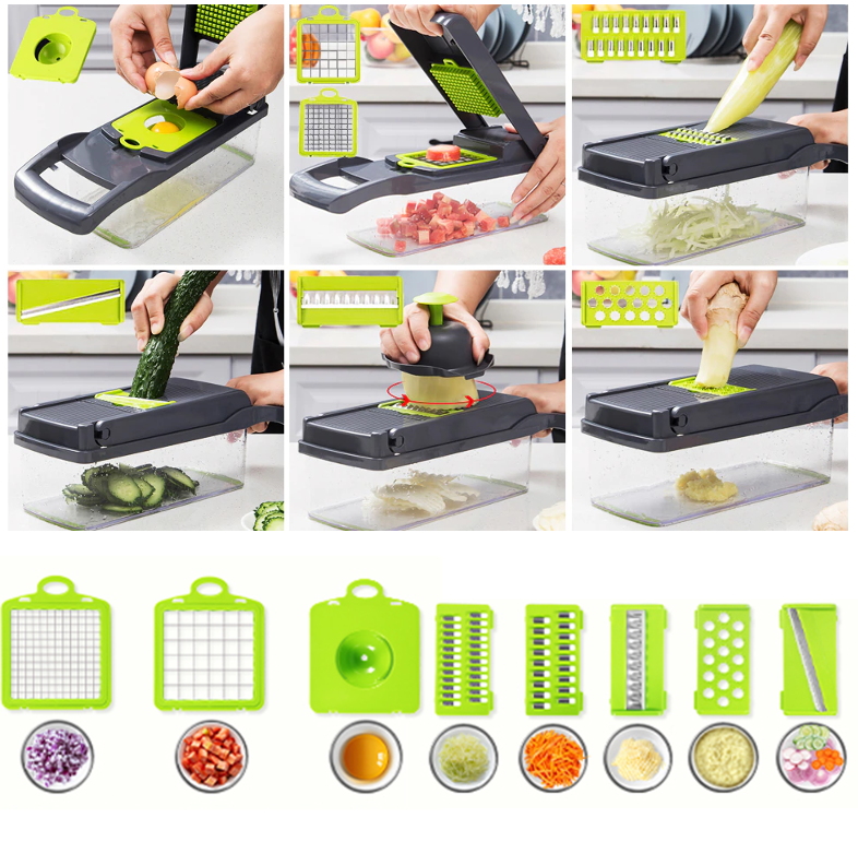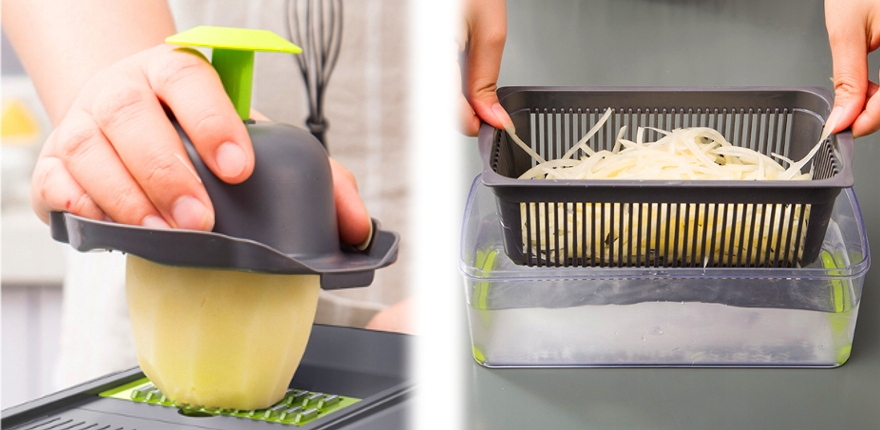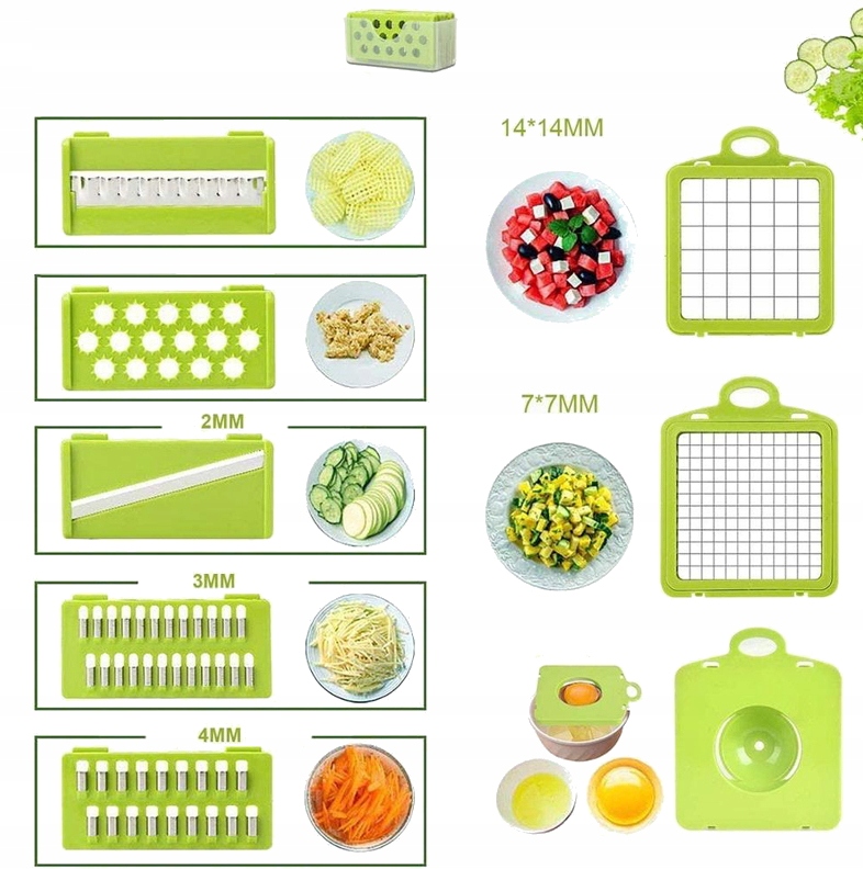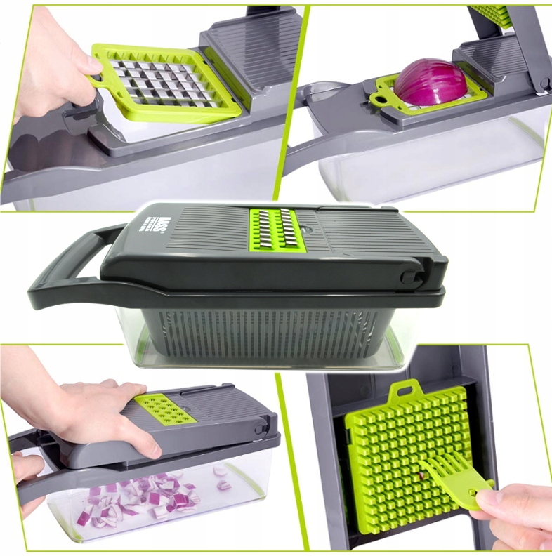 Wielofunkcyjne urządzenie kuchenne łączy w sobie funkcje krajalnicy, tarki i szatkownicy do warzyw. Umożliwia szybkie pokrojenie warzyw i owoców w kostkę na sałatkę, starcie włoszczyzny na zupę, pokrojenie owoców na deser. Wyposażona w wymienne ostrza ze stali nierdzewnej. Krajalnica z szatkownicą jest łatwa w czyszczeniu. Po prostu włóż ją do zmywarki! Materiał wykonania jest wolny od Bisfenolu. ✅ W ZESTAWIE DODATKOWE AKCESORIA Krajalnica posiada wygodny pojemnik, pozwala na przechowywanie pokrojonych produktów np. w lodówce czy szafce. Pojemnik posiada antypoślizgowe podkładki. Do zestawu dołączono również koszyczek do odsączania wody. Urządzenie posiada wygodny uchwyt, dzięki któremu zetrzesz produkty prosto do pojemnika.