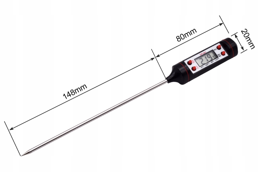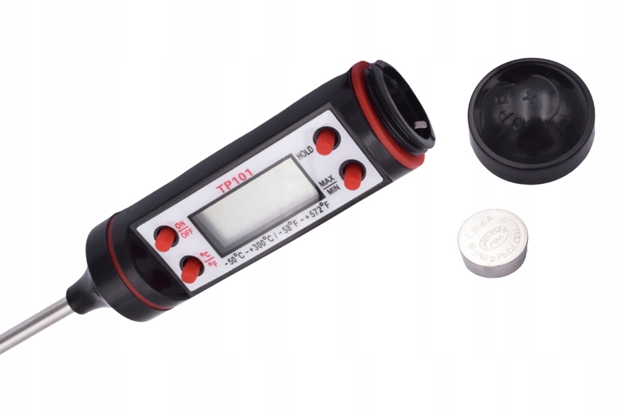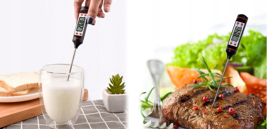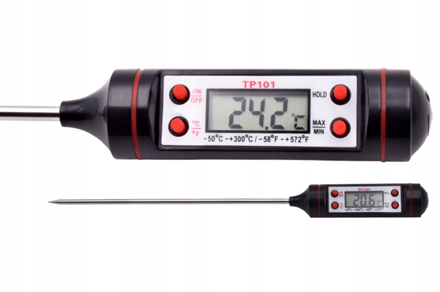 Termometr do mierzenia temperatury potraw, wypieków i płynów jest niezbędnym elementem wyposażenia kuchni każdego świadomego kucharza. Termometr kuchenny Bass Polska umożliwia pełna kontrolę temperatury potrawy w trakcie przygotowywania. Dzięki dokładnemu termometrowi kuchennemu unikniesz sytuacji, w której potrawa jest gotowa z wierzchu lecz surowa w środku. Termometr będzie szczególnie przydatny, jeśli często pieczesz mięso. Wystarczy włożyć termometr ze szpikulcem w sam środek np. kurczaka, aby upewnić się, czy upiekł się także wewnątrz. Spiczastą, długą końcówkę z łatwością umieścisz w środku rosnącego ciasta. Bez problemu przebije ona także twardą skórkę chleba. Dzięki długiej konstrukcji termometru, możesz sprawdzać temperaturę w rozgrzanym piekarniku w bezpieczny sposób, nie obawiając się poparzeń. Termometr posiada dwie jednostki pomiaru do wyboru. W zależności od preferencji i przepisu sprawdzisz temperaturę w stopniach Celsjusza lub Farenheita. Duży wyświetlacz umożliwia natychmiastowy i wygodny odczyt. Termometr zapamiętuje także maksymalne i minimalne wyniki pomiaru. Co więcej, termometr wyłączy się automatycznie po dziesięciu minutach od ostatniego użycia. Funkcja oszczędzania energii jest szczególnie przydatna w ferworze gotowania. Możesz odłożyć termometr na blat bez obaw, że bateria się wyczerpie! ✅ SPECYFIKACJA