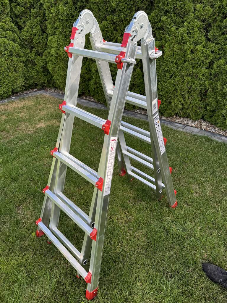 Konstrukcja drabiny wyposażona w mocne, stalowe przeguby, które umożliwiają płynne i szybkie zmienianie pozycji drabiny. Przeguby są nitowane do profilu drabiny, co umożliwia również ich wymianę (jako części ruchomej - eksploatacyjnej). Przeguby to również część wyróżniająca nasze drabiny na tle konkurencji. Zastosowane w naszych drabinach duże, stalowe, mocne przeguby charakteryzują się wysoką wytrzymałością, trwałością i niezawodnością. Dołożyliśmy wszelkich starań, aby nasze przeguby były najwyższej jakości. Możemy pochwalić się, że są niezawodne a lekko pracujący system ryglowania zapewnia szybką i komfortową obsługę. Drabinę przegubową 5x4 można również rozłożyć w klasycznej pozycji tzw. wolnostojącej nazywanej również malarską. Dzięki temu ustawieniu wykonasz większość lekkich prac do wysokości roboczej min. 140cm Innowacyjny system blokowania wysokości drabiny został zaprojektowany tak, aby maksymalnie ułatwić i przyspieszyć pracę z drabiną. Dodatkowo elementy ryglujące oparte na systemie sprężyn zamontowane zostały w taki sposób aby ich obsługa była bezpieczna dla użytkownika. Regulacja wysokości odbywa się stopniowo i skok wynosi dokładnie 25cm. Dzięki swoim niewielkim wymiarom drabina po złożeniu jest łatwa w magazynowaniu oraz transporcie. Jej wysokość po złożeniu to zaledwie 146cm - dzięki temu bez problemu zmieści się w bagażniku nawet mniejszego samochodu. Całkowita waga drabiny to 11,6 kg - każdy bez problemu poradzi sobie z jej przeniesieniem i ustawieniem w żądanej pozycji. ✅ Parametry techniczne : Możliwość stosowania drabiny jako: