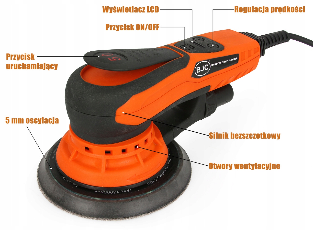 Szlifierka BJC to wysoce specjalistyczny produkt przeznaczony do profesjonalnego polerowania powłok lakierniczych w samochodach, meblach i łodziach, doskonale sprawdza się również w nowoczesnych technologiach tynkarsko-malarskich. Szlifierka elektryczna posiada zasilanie na 230V oraz silny i trwały silnik bezszczotkowy. Wyposażona jest w technologię wibracyjno-rotacyjną, która dzięki odpowiedniej oscylacji tarczy ściernej zwiększa efektywność szlifowania, obniża temperaturę powierzchni i zapewnia szybki efekt pracy. Szlifierka posiada tarczę z rzepem i otworami odpylającymi o średnicy 150 mm, która pracuje w systemie DUAL ACTION, czyli posiada dodatkową rotację, tak zwany offset o skoku 5 mm. Do szlifierki można mocować specjalne papiery ścierne i pady szlifierskie, mocowane na rzep. Otwory czyszczące w krążkach umożliwiają odebranie pyłu i odprowadzenie go do odkurzacza.