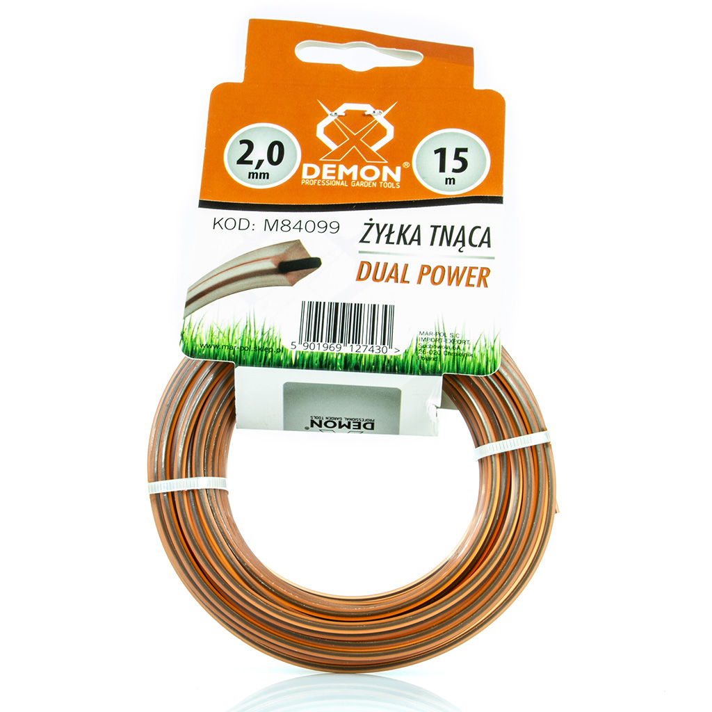 Profesjonalna żyłka tnąca DEMON DUAL POWER Przeznaczona do kos i podkaszarek spalinowych lub elektrycznych. Jakość materiału pozwala na cięcie przez wiele sezonów. Cechuje się on dużą wytrzymałością na uderzenia w twarde przedmioty. Żyłka jest giętka - podatna na konkretną siłę zamachową. Kształt nadaje jej większą wytrwałość przy bardzo wysokich obrotach oraz równocześnie ostre krawędzie profila pozwala na lekkość pracy. ✅ Dane techniczne: Żyłki tnące są mocne, pozostają elastyczne przez długi czas są odporne na działanie wysokich temperatur. 》》》 ŻYŁKA ZBROJONA DO KOSY SPALINOWEJ PODKASZARKI 2.0mm 15m KWADRAT M84099 《《《