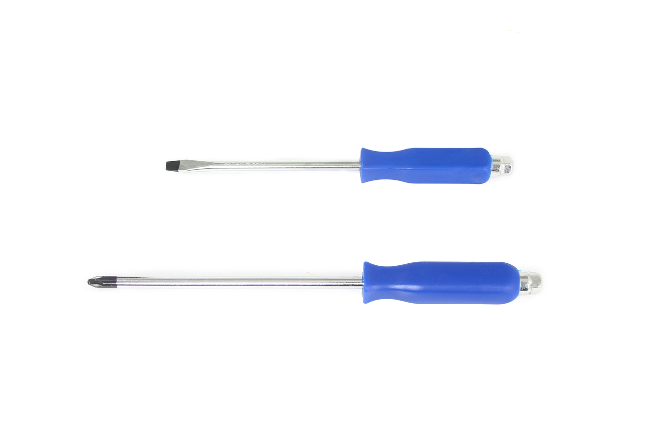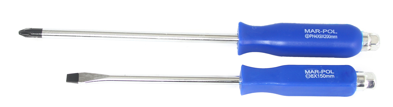 Zestaw 12 wkrętaków ślusarskich do pobijania wykonanych ze stali chromowo-wanadowej (CrV). Trzon wkrętaka przechodzi przez całą jego rękojeść, zakończony metalową główką z sześciokątnym zabierakiem, dzięki czemu może być wspomagany kluczem oraz doskonale nadaje się do pracy z młotkiem. Cechy produktu: ZAWARTOŚĆ ZESTAWU: 6szt. wkrętaki krzyżakowe: 6szt. wkrętaki płaskie: