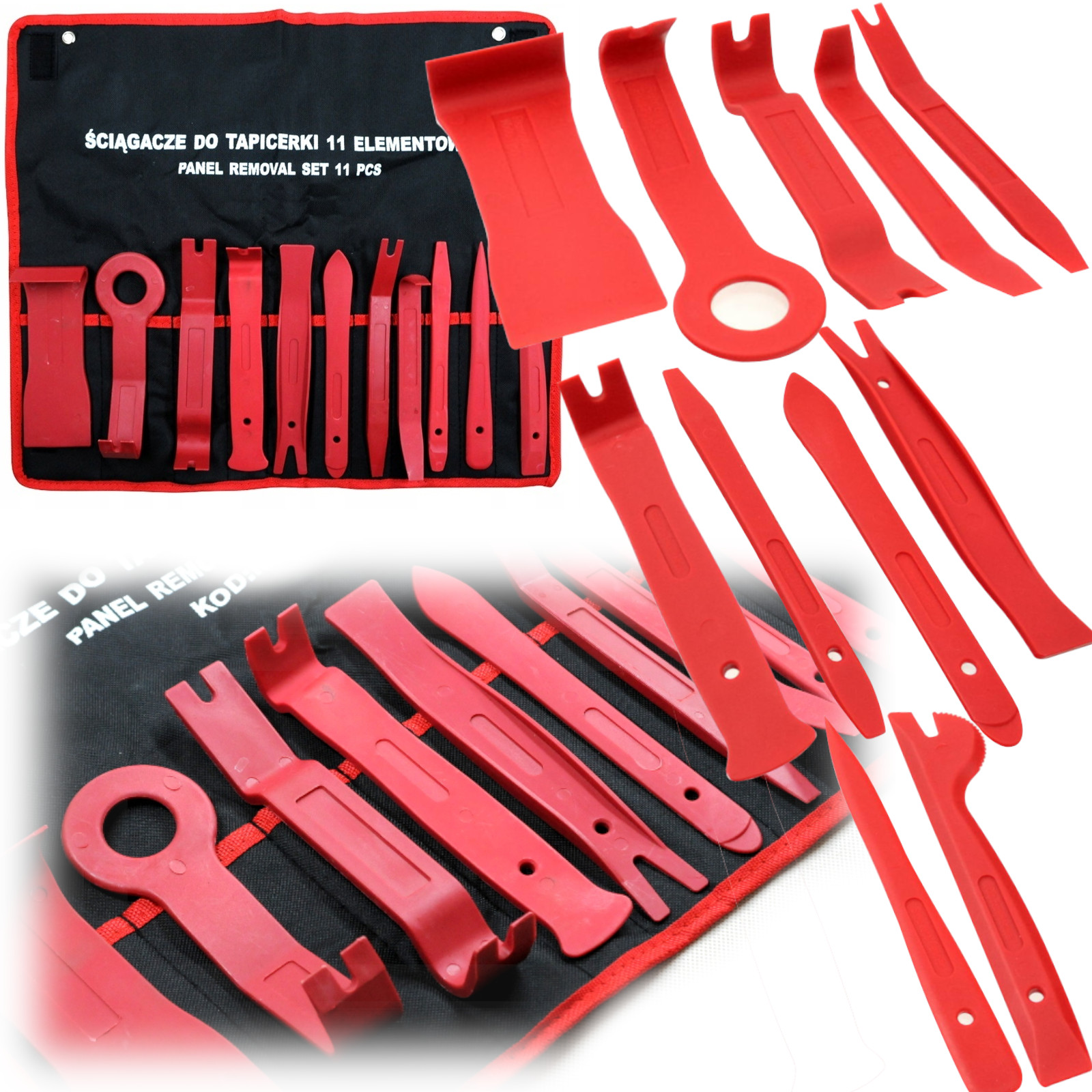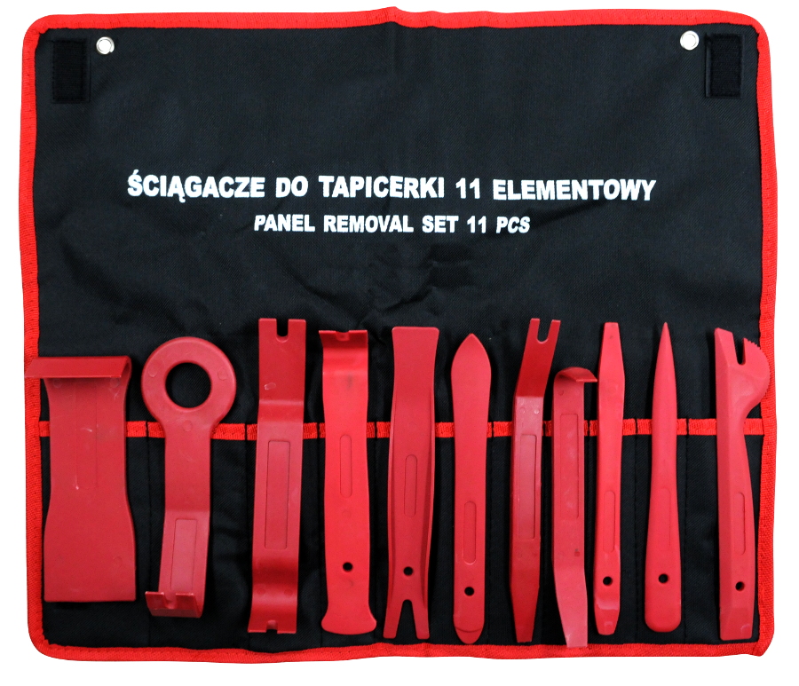 Specjalistyczne profesjonalne ściągacze do demontażu różnych rodzajów tapicerek i listew samochodowych. Ściągacze wykonane są z utwardzonego nylonu, posiadają specjalne profile umożliwiające użycie dźwigni przy demontażu spinek tapicerskich. Zaletą ściągaczy jest to, że nie powodują one trwałych zarysowań tapicerki, co ma wpływ na zachowanie estetyki wnętrza samochodu. Zestaw polecany do prac w serwisach samochodowych, tapicerskich, blacharskich i lakierniczych