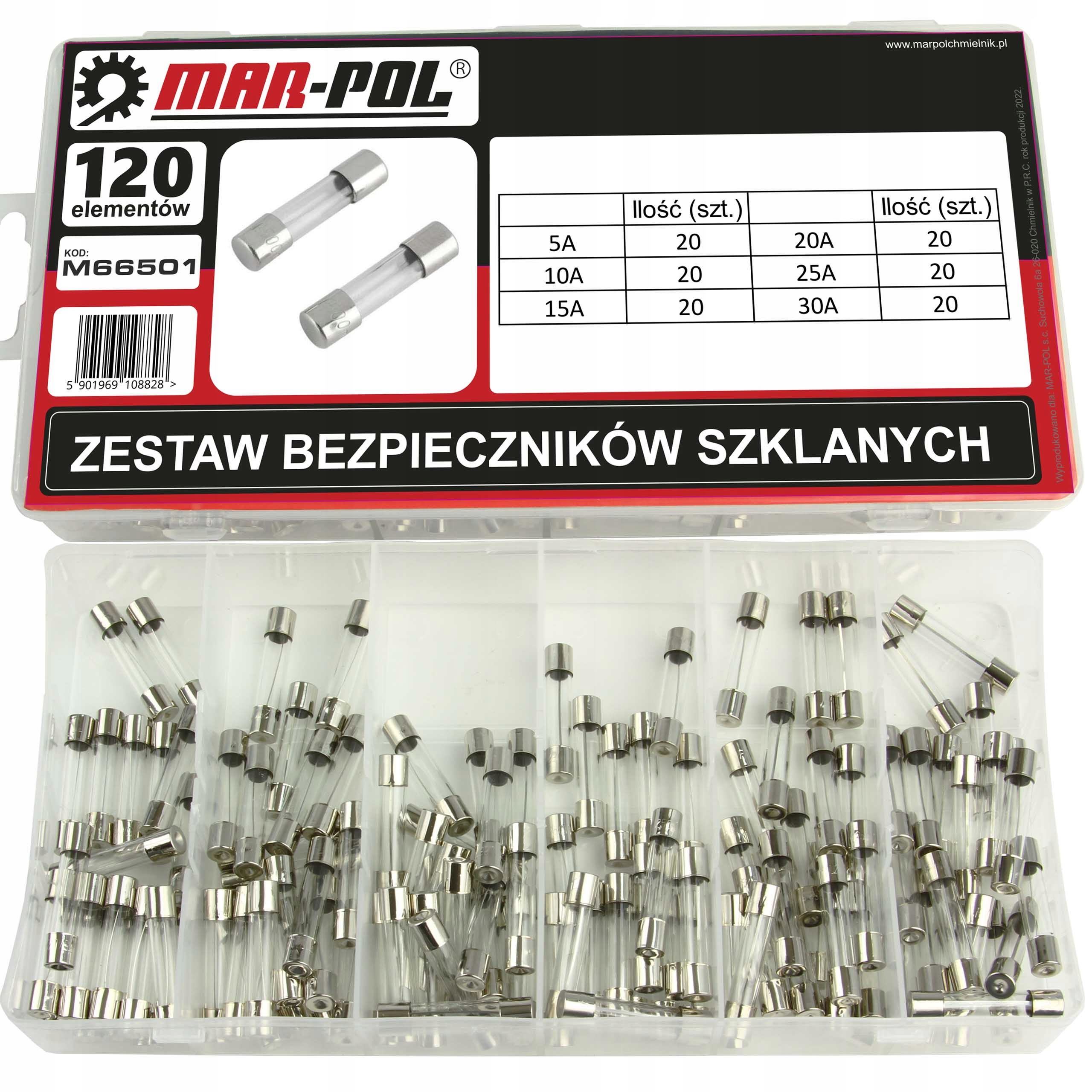 Zestaw bezpieczników szklanych, rurkowych służą do przerwania obwodu elektrycznego po przekroczeniu nominalnego napięcia prac. Są to wysokiej jakości bezpieczniki samochodowe, wykonane z najwyższej klasy materiałów, które zapewnią bezpieczeństwo instalacji każdego pojazdu. W prezentowanym zestawie znajduje się 120szt bezpieczników o 6 różnych natężeniach w wygodnym, praktycznym pudełku. Firma MAR-POL powstała w 2000 roku. Początek działalności przedsiębiorstwa opierał się na sprzedaży narzędzi i elektronarzędzi wiodących marek polskich i zagranicznych. Z czasem zdobyte doświadczenie pozwoliło poszerzyć ofertę produktów i rozpocząć produkcję oraz import własnego sprzętu. Obecnie MAR-POL jest jedną z najbardziej konkurencyjnych firm z Europy Środkowej oferujących szerokiej maści narzędzia. Wszystkie produkty MAR-POL charakteryzują się dbałością o szczegóły w osiągnięciu jakości oraz dostępności cenowej dla każdego Klienta. Szeroki asortyment gwarantuje pełną satysfakcję zarówno amatorom-hobbystom, jak i użytkownikom profesjonalnym.
