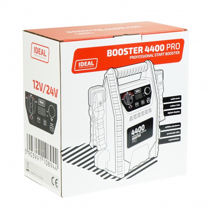 BOOSTER 4400 PRO jest przenośnym akumulatorem do wspomagania rozruchu samochodów osobowych, dostawczych oraz lekkich ciężarowych (silniki: benzynowe, diesla) Urządzenie wyposażone jest w cyfrowy wyświetlacz, który w zależności od wybranego trybu może pokazać: napięcie akumulatora bądź stopień naładowania (%). Akumulatory montowane w urządzeniu mają bardzo dużą żywotność (do 400 ładowań). Specjalna konstrukcja klem zapewniająca równomierny rozkład natężenia prądu. Zamontowana listwa z diodami LED działa w 5 trybach świecenia. Ułatwia podłączenie urządzenia w niesprzyjających warunkach, oraz umożliwi wyświetlenie sygnału SOS w sytuacjach awaryjnych. BOOSTER posiada gniazdo USB A (5V, 2,4A) oraz gniazdo 12V DC (15A) co czyni go wielofunkcyjnym źródłem prądu. Urządzenie posiada zabezpieczenie przeciw nagłym skokom napięcia oraz sygnalizację dźwiękową odwrotnej polaryzacji. Zastosowanie trwałej obudowy przedłuża żywotność urządzenia.