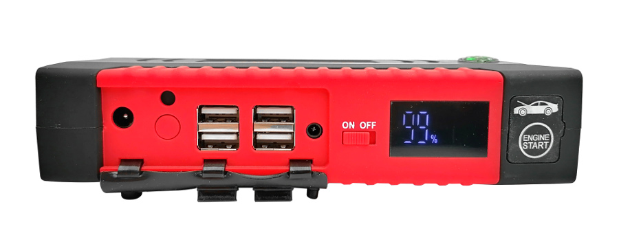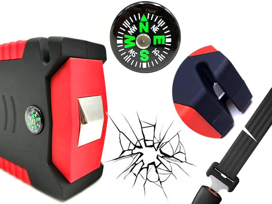 Przenośny akumulator jest to urządzenie do wspomagania rozruchu silników samochodowych. Awaryjnie wspomaga uruchomienie samochodów z silnikami benzynowymi do 5 litrów oraz diesla do 3 litrów. Napięcie rozruchu ma 12V. Znajduje zastosowanie w przypadku motorów, samochodów, motorówek itp. Dodatkowo Powerbank - urządzenie może służyć jako przenośny bank energii dla wielu urządzeń elektronicznych takich jak: laptopy, tablety, telefony komórkowe, GPSy i inne. ✅ DANE TECHNICZNE: Czas ładowania: ZAWARTOŚĆ OPAKOWANIA : wtyki - adaptery do ładowania różnych urządzeń: ❗ Powerbank posiada młotek bezpieczeństwa do szyb do ucieczki w razie wypadku. ❗ Nóż do przecinania pasów bezpieczeństwa. ❗ Wbudowany kompas - idealny do lokalizowania pozycji na mapie lub w terenie. SYGNAŁY ŚWIETLNE Powerbank posiada 3 tryby świecenia światłem białym. Urządzenie jest wyposażone również w tryb oświetlenia awaryjnego. Aby uruchomić czerwono-niebieskie koguty dwukrotnie należy wcisnąć przycisk.