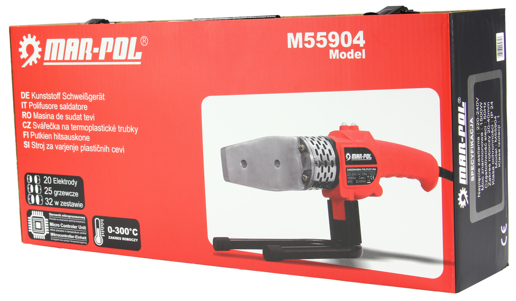Zgrzewarka MAR-POL ma zastosowanie przy pracach hydraulicznych i kanalizacyjnych, które wymagają zgrzewania i plastycznego odkształcania rur lub kształtek. Zgrzewarka służy do polifuzyjnego zgrzewania rur i kształtek z tworzyw termoplastycznych (polietylen,polipropylen itp) podczas wykonywania instalacji: wody zimnej, wody ciepłej, centralnego ogrzewania. W komplecie 3 matryce które są najczęściej używane o rozmiarze : 20, 25, 32mm. Wszystko w metalowej walizce. Zestaw najczęściej wykorzystywany będzie podczas montażu układów centralnego ogrzewania czy też obiegów wody zarówno ciepłej jak zimnej. Intuicyjna i precyzyjna regulacja temperatury. Analogowy potencjometr umożliwia precyzyjny dobór temperatury roboczej w zakresie od 50 - 300°C.