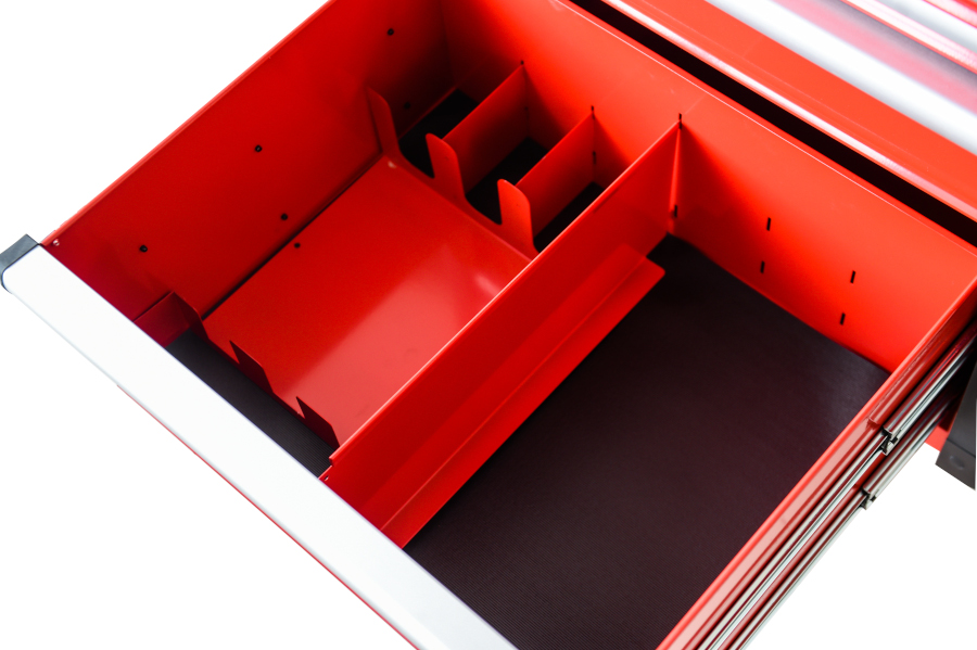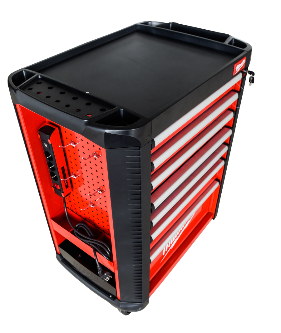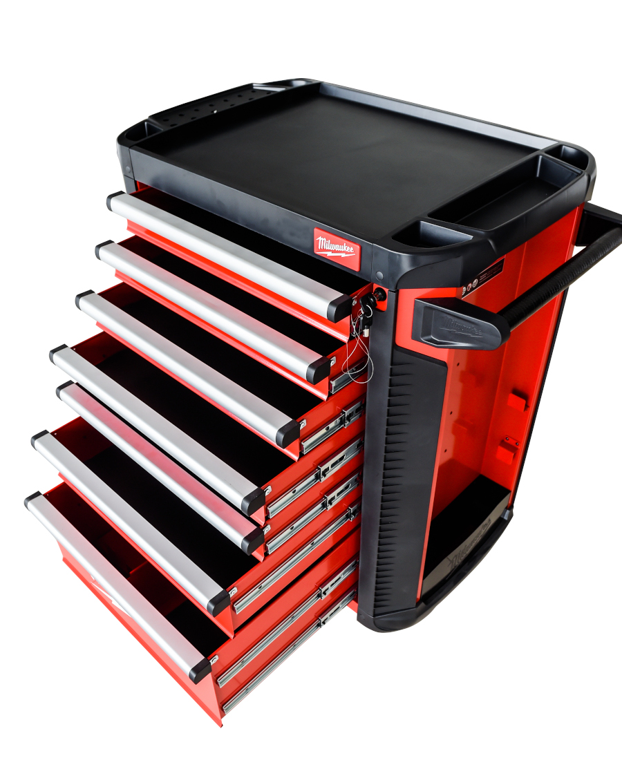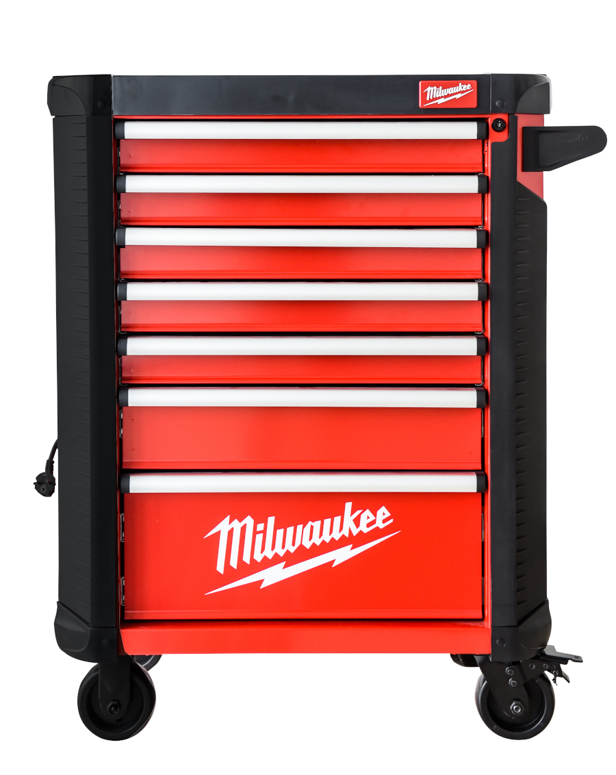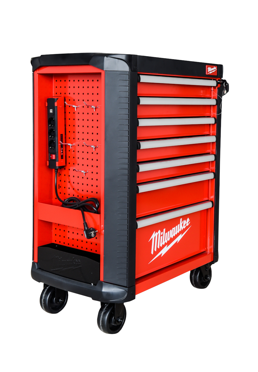 Szuflady z cichym domykiem o ładowności 45 kg. Dolna szuflada o ładowności 90 kg. Zabezpieczenie przed przechyleniem - jednocześnie można otworzyć jedną szufladę. Każda szuflada posiada matę antypoślizgową. Wpuszczony, gładki blat z ABS z otworami na wkrętaki i dodatkowymi schowkami. Amortyzujące narożniki z ABS. Magnetyczna listwa zasilająca umożliwia ładowanie akumulatorów bezpośrednio na szafce. Tablica z otworami na haki i uchwyty pozwala na łatwy dostęp do najczęściej używanych narzędzi. Dodatkowe boczne półki na butelki i puszki. Organizer na elektronarzędzia w dolnej szufladzie. Przemysłowe koła 125 mm, dwa stałe i dwa obrotowe z hamulcami. Całkowity udźwig 800 kg. ✅ Wymiary: Ilość szuflad 7szt.》》》 SZAFKA NARZĘDZIOWA WÓZEK WARSZTATOWY 78cm MILWAUKEE ® 4932478849 《《《