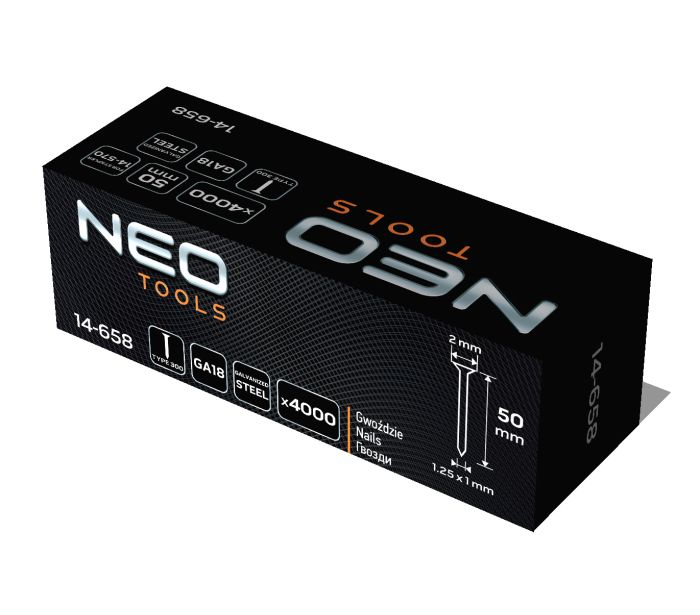 Gwoździe galwanizowane do zszywacza pneumatycznego, GA18, Typ 300 (F), długość 50 mm, 4000 sztuk 14-658 NEO to wysokiej jakości akcesoria, które przeznaczone są do wszelkiego rodzaju prac ze zszywaczem pneumatycznym. Opakowanie zawiera aż 4000 sztuk, co jest ekonomicznym sposobem na posiadanie dużego zapasu wkładów – idealnego dla profesjonalistów oraz zawodowców. Gwoździe są galwanizowane, co czyni je odpornymi na korozję. Nie klinują się w urządzeniu, ułatwiając pracę. Gwarantują trwałe oraz pewne łączenia. Świetnie sprawdzą się w pracach domowych, do montażu siatek, drucianych ogrodzeń, listew drewnianych, tkanin lub metalowych folii.