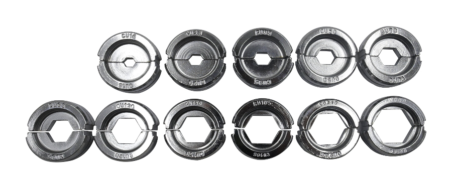 - Wymienne matryce typu CU w zestawie. Komplet matryc: 16, 25, 35, 50, 70, 95, 120, 150, 185, 240, 300 mm2 pozwala dopasować narzędzie do różnych typów kabli i złączek.