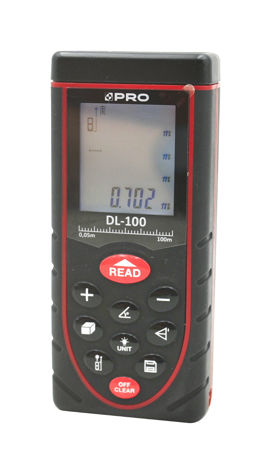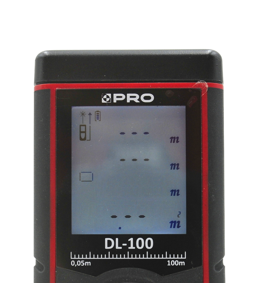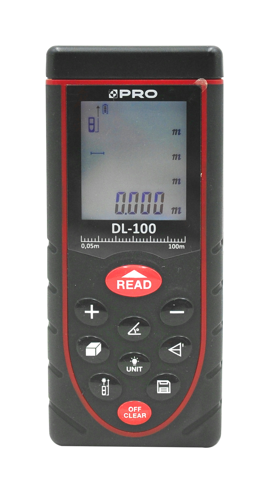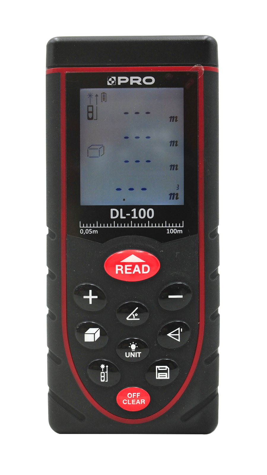 Dalmierz laserowy DL-100 służy do pomiarów odległości, powierzchni oraz kubatury wybranego obiektu. Posiada funkcje: pomiaru pośredniego (wzbogaconą o możliwość obliczania sumy i różnicy), pomiaru ciągłego i dynamicznego. Posiada funkcję pomiaru kąta nachylenia (± 45°). Umożliwia pracę w zakresie od 0,2 m do 100 m, dokładność pomiaru wynosi ± 2 mm. Dwa punkty odniesienia pomiaru: przednia ścianka oraz tylna ścianka urządzenia. Podświetlany ekran LCD. Rozbudowana pamięć umożliwia zapisywania pomiarów (do 99) oraz wykonywanie na nich działań dodawania oraz odejmowania. Antypoślizgowe przycisk. Mocowanie statywu 1/4".