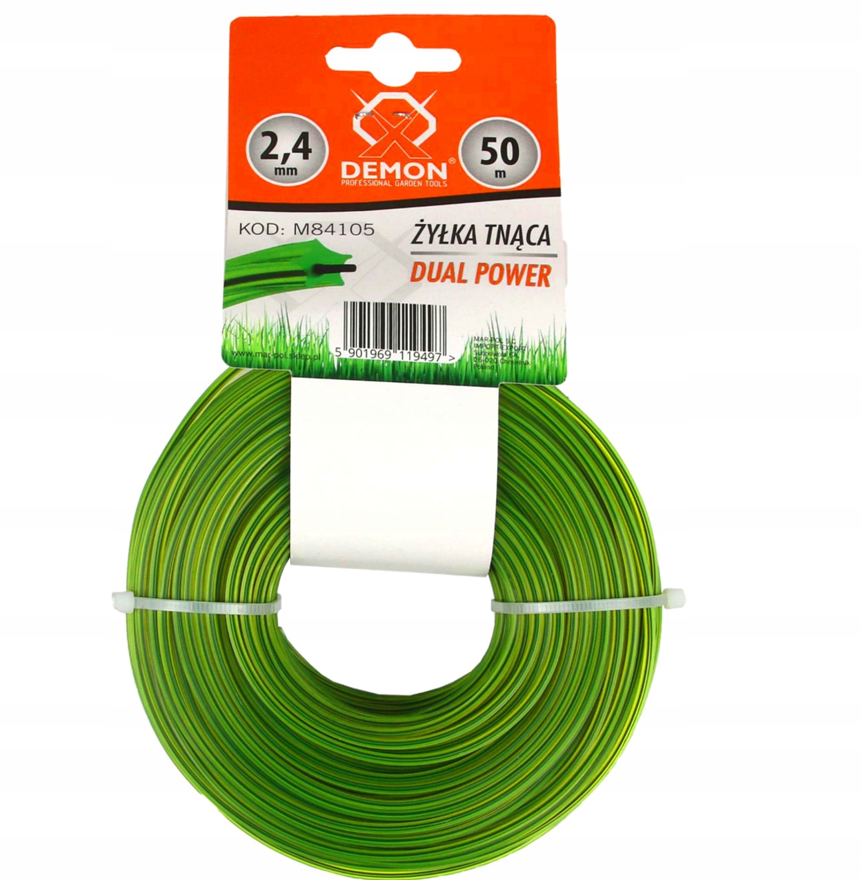 Profesjonalna żyłka tnąca DEMON DUAL POWER Przeznaczona do kos i podkaszarek spalinowych lub elektrycznych. Jakość materiału pozwala na cięcie przez wiele sezonów. Cechuje się on dużą wytrzymałością na uderzenia w twarde przedmioty. Żyłka jest giętka - podatna na konkretną siłę zamachową. Kształt nadaje jej większą wytrwałość przy bardzo wysokich obrotach oraz równocześnie ostre krawędzie profila pozwala na lekkość pracy. Żyłki tnące są mocne, pozostają elastyczne przez długi czas są odporne na działanie wysokich temperatur.