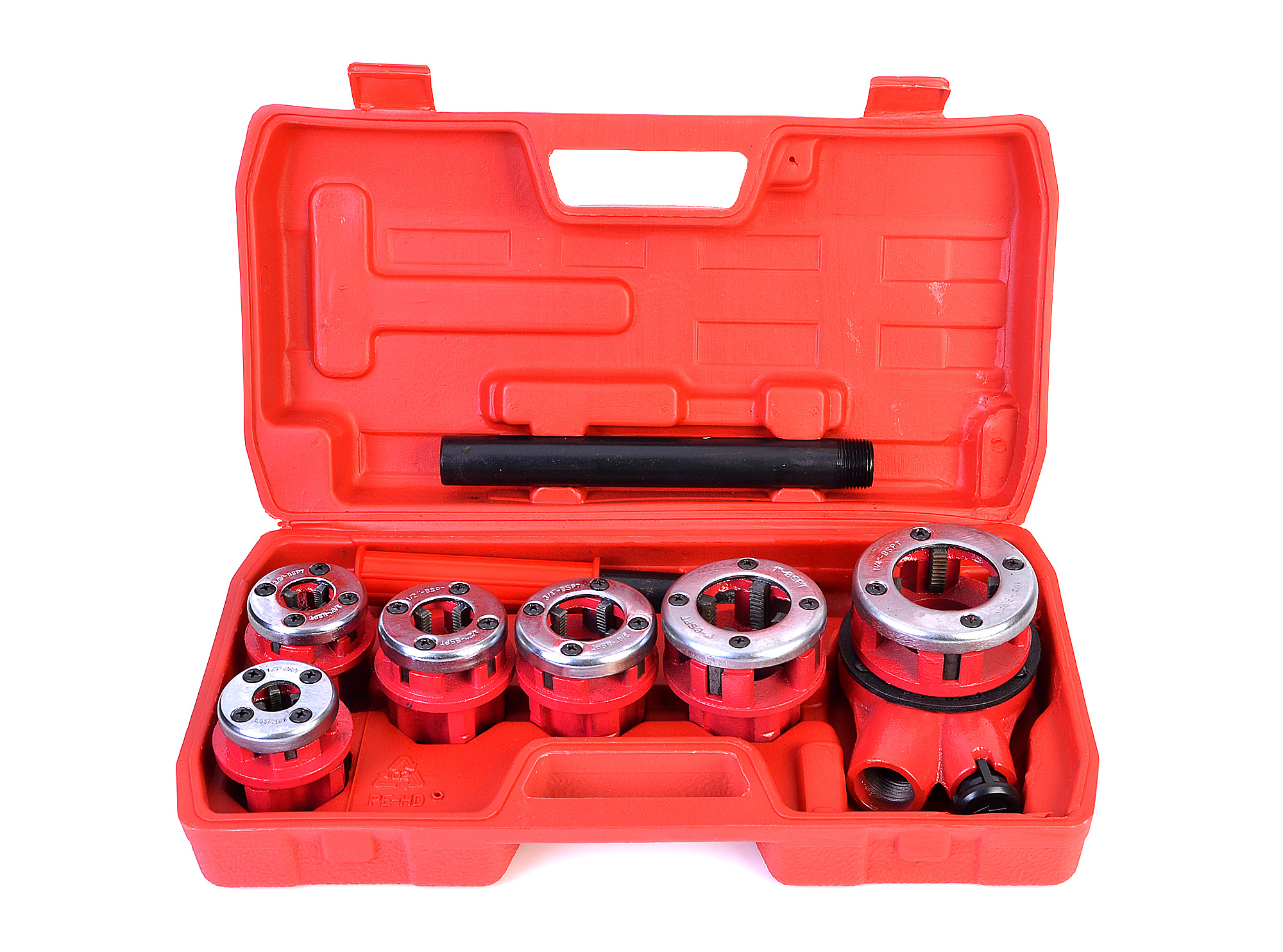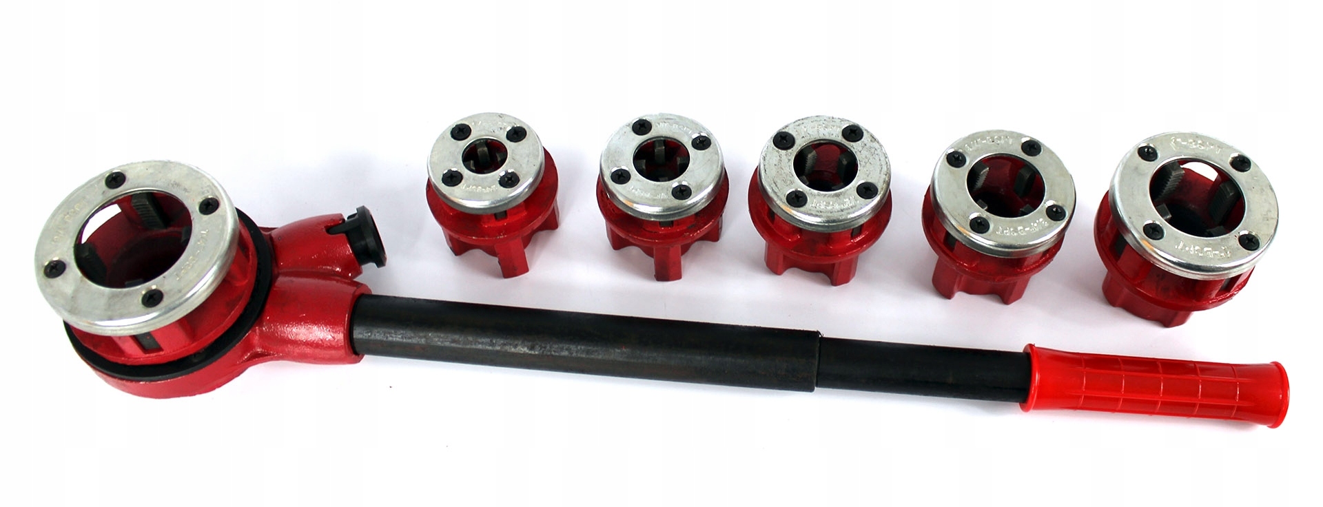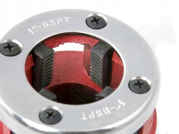 Gwintownica hydrauliczna do rur w zestawie z 6 narzynkami. Urządzenie służy do gwintowania rur i kształtek. Znajdzie zastosowanie zarówno podczas remontu jak i na budowie. Zęby gwintownicy wykonane ze stali stopowej CrV o twardości HRC w zakresie 58-62. Żeliwna obudowa narzynek. Cechy produktu: Zawartość zestawu: