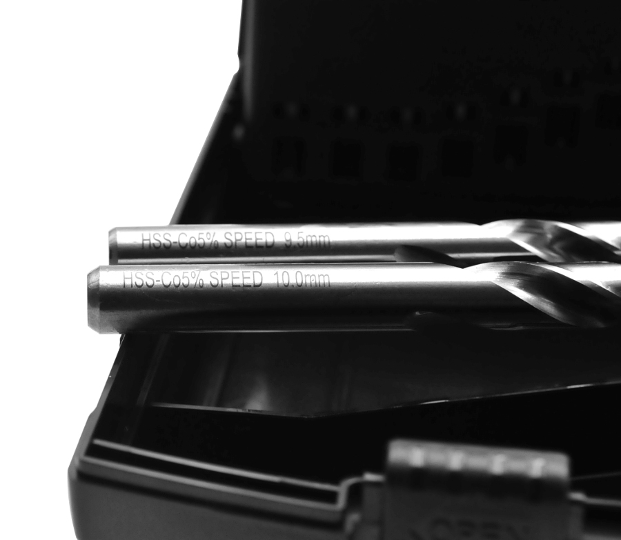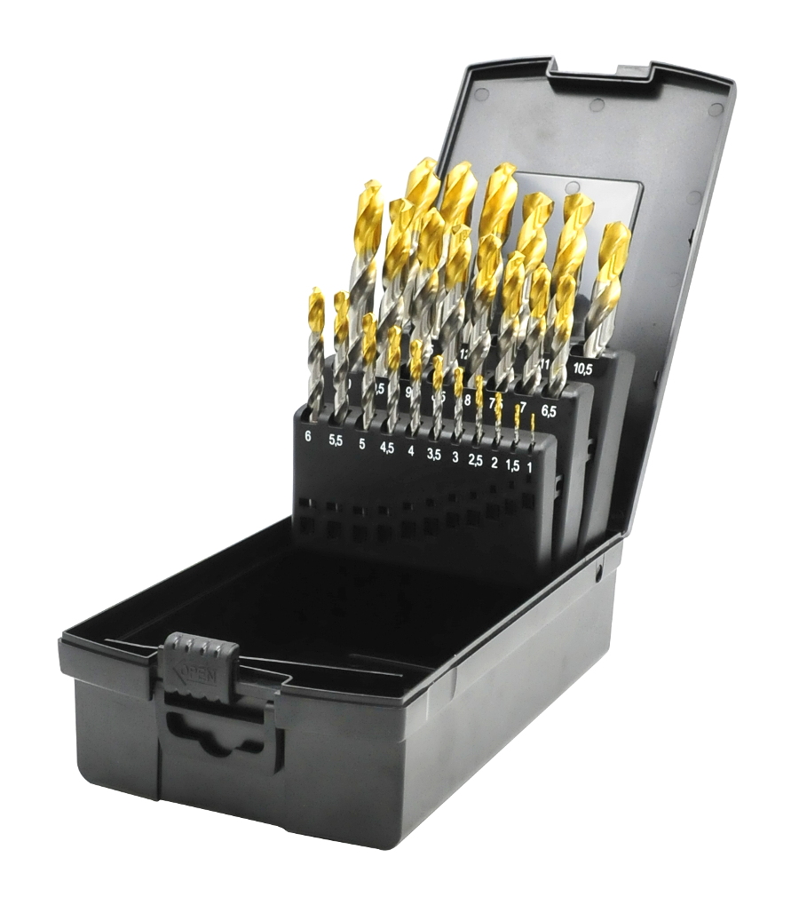 Zestaw 25szt. wierteł do metalu 1,0-13,0mm wykonanych ze stali szybkotnącej HSS-Co5%. Wiertła zgodne z normą DIN 338. Uchwyt cylindryczny. Posiadają dwa centralne ostrza szlifowane pod kątem 135° oraz rowki które skutecznie odprowadzają wiór w górę otworu. Wykonane są z najwyższej jakości stali szybkotnącej HSS z dodatkiem 5% kobaltu , co czyni je niezwykle wytrzymałymi i trwałymi oraz powłokę TiN (powłoka tytanowa) która poszerza zakres zastosowania.