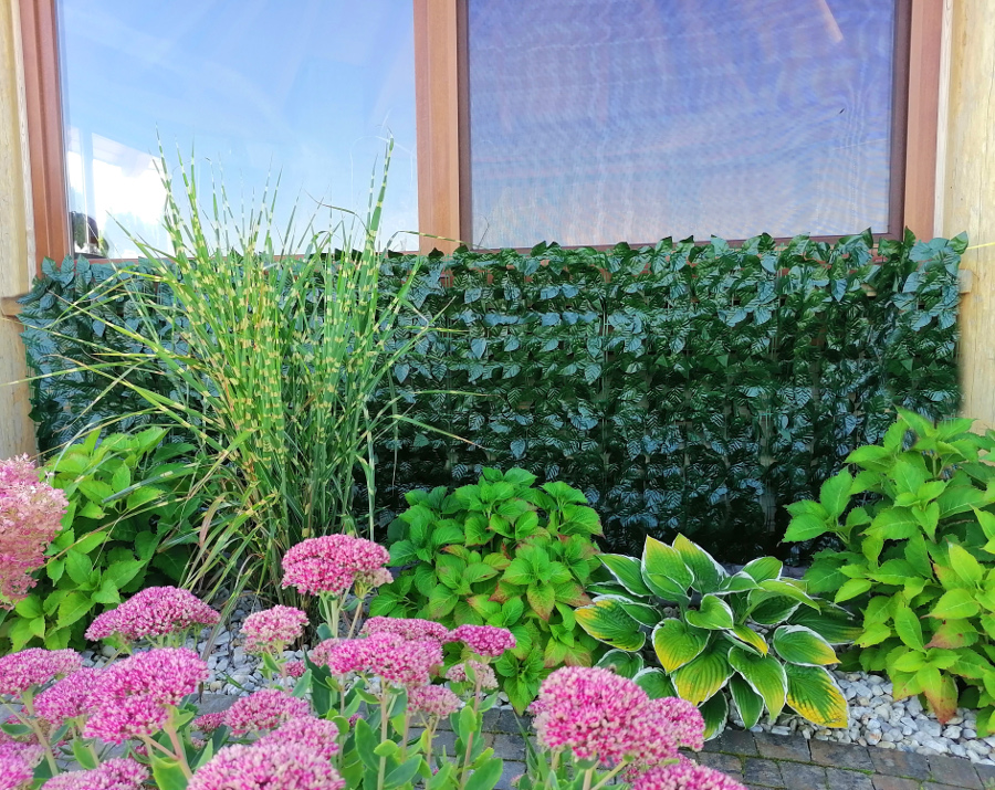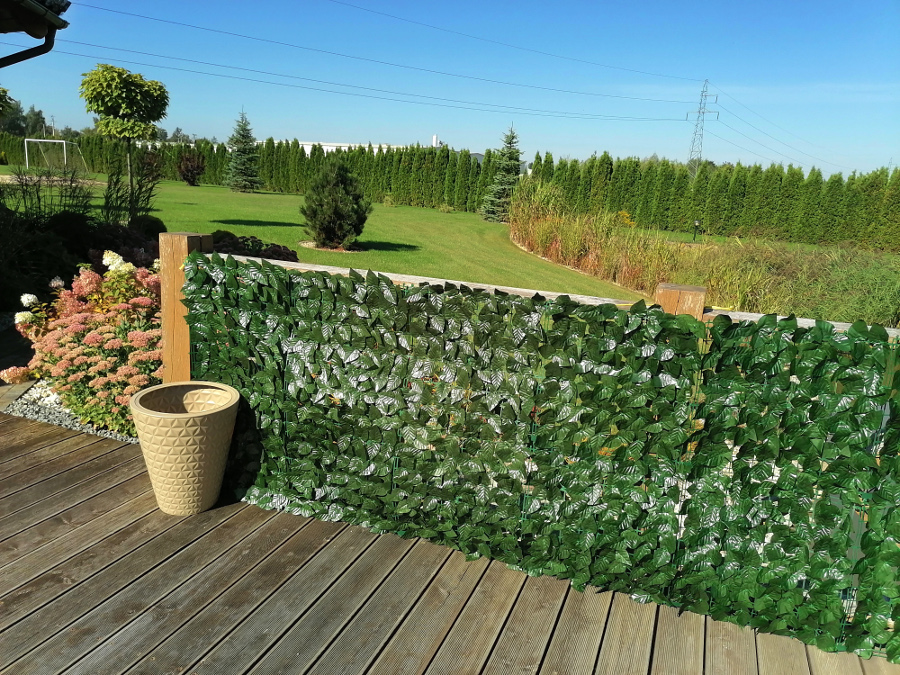 Siatka imitująca bluszcz zapewnia prywatność w ogrodzie i na podwórku. Przymocowana do siatki ogrodzeniowej lub płotu doskonale zasłania widok na podwórko i ogród z ulicy. Siatka ze sztucznymi liśćmi daje maksymalną ochronę przed ciekawskimi spojrzeniami sąsiadów. Siatka z bluszczem umożliwia także estetyczne wydzielenie obszaru na podwórku lub w ogrodzie. Pomoże wyrównać ścieżkę i podjazd. W zależności od potrzeb, użyj siatki jako żaluzji lub rolety. W mieście, sprawdzi się doskonale jako siatka na balkon lub taras. W okresie wiosennym i letnim siatka pomoże stworzyć w ogrodzie dodatkowy cień. Dzięki gęsto tkanym liściom siatka stanowi doskonałą ochronę przed wiatrem i kurzem. W sezonie jesienno zimowym siatka imitująca bluszcz doda koloru w ogrodzie i ubarwi widok za oknem. Zamocowana na balkonie osłoni przed wiatrem i spadającymi liśćmi. Stworzy także barierę dla kurzu i pyłu z ulicy. Tworzywo jest bardzo odporne na warunki atmosferyczne, promienie UV i ścieranie. Dzięki tym właściwościom jest to maskująca siatka całoroczna. Sztuczne liście posiadają żłobienia, które upodabniają je do prawdziwych. Gęste pokrycie tworzy bardzo estetyczną taflę, którą docenią wszyscy miłośnicy natury. Ze względu na doskonałą jakość wykonania, siatki ze sztucznym bluszczem mogą być wykorzystywane jako ozdoby pomieszczeń. Wyglądają bardzo spektakularnie jako element tzw. zielonej ściany. Sztuczny bluszcz w rolce może także posłużyć jako dekoracja w szkolnym przedstawieniu.