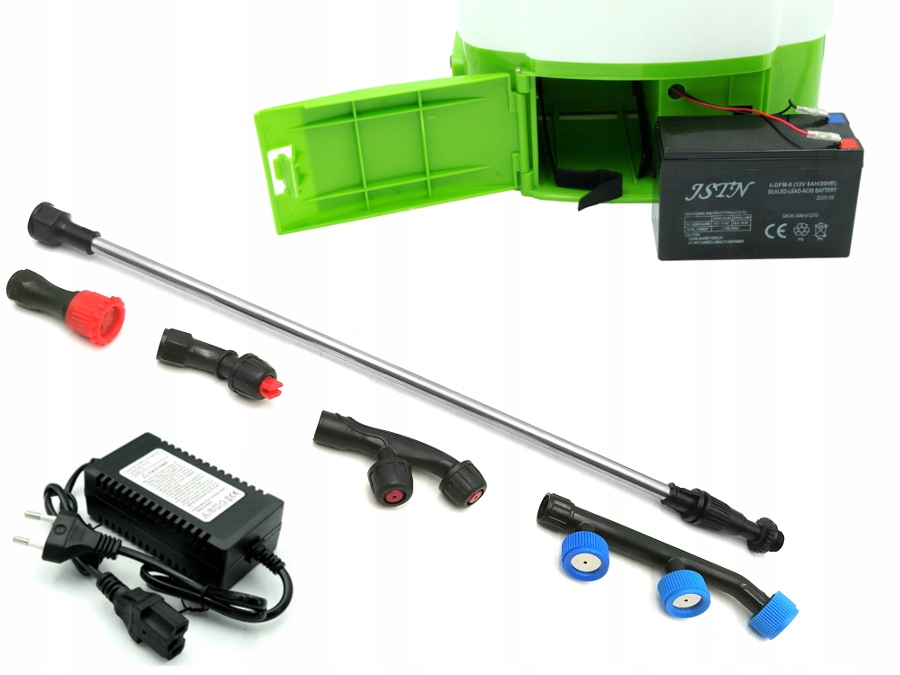 Elektryczny opryskiwacz plecakowy, dyszowy zasilany silnikiem elektrycznym ( akumulatorowym ). Opryskiwacz jest wysoce skutecznym narzędziem pracy przy ochronie roślin. Może być stosowany w zapobieganiu chorób roślin i usuwaniu szkodników na dużych plantacjach i polach uprawnych zbóż, ogrodów, kwiatów, drzewek owocowych i herbacianych, itd. Jest doskonałym urządzeniem do prac ochronnych i pielęgnacyjnych w warzywnictwie, sadownictwie, kwiaciarstwie i szkółkarstwie. Może być również używany do rozpylania herbicydów, odkażania. Idealnie nadaje się do pomieszczeń zamkniętych np. szklarni, wszędzie tam gdzie nie mogą być stosowane inne opryskiwacze, np. spalinowe ( spaliny ) lub z ręczną pompką ( ze względu na trudne poruszanie ). ✔️ Kompaktowy i ergonomiczny. Zbiornik został zaprojektowany tak, aby dopasować się do pleców użytkownika. Zapewnia to wygodną i komfortową pracę. ✔️ Kompaktowa pompa membranowa zapewnia duże ciśnienie przy małych rozmiarach. Pompa jest wytrzymała i wyposażona w zawór bezpieczeństwa automatycznie ograniczający ciśnienie w układzie. ✔️ Potrójny filtr wewnętrzny zapobiegający zapychaniu się dyszy. Filtr jest prosty w demontażu i czyszczeniu. ✔️ System ostrzegania przed niskim poziomem napięcia. Pozwala to chronić akumulator przed uszkodzeniem. ✅ DANE TECHNICZNE: W ZESTAWIE: Przyłącze 4-dyszowe przeznaczone jest do wykonywania zabiegów ochrony roślin w uprawach rzędowych, plantacjach truskawek, trawnikach i innych terenach zielonych. Przyłącze posiada 4 dysze rozmieszczone w odstępach 38 cm. Dzięki kilku dyszom skraca się czas pracy, a przy tym zwiększa efektywność i dokładność przeprowadzanych zabiegów. Lanca do opryskiwaczy plecakowych Duża dysza rozpylająca , ośmiostrumieniowa do opryskiwaczy ciśnieniowych ( plecakowych , ręcznych , akumulatorowych ) .